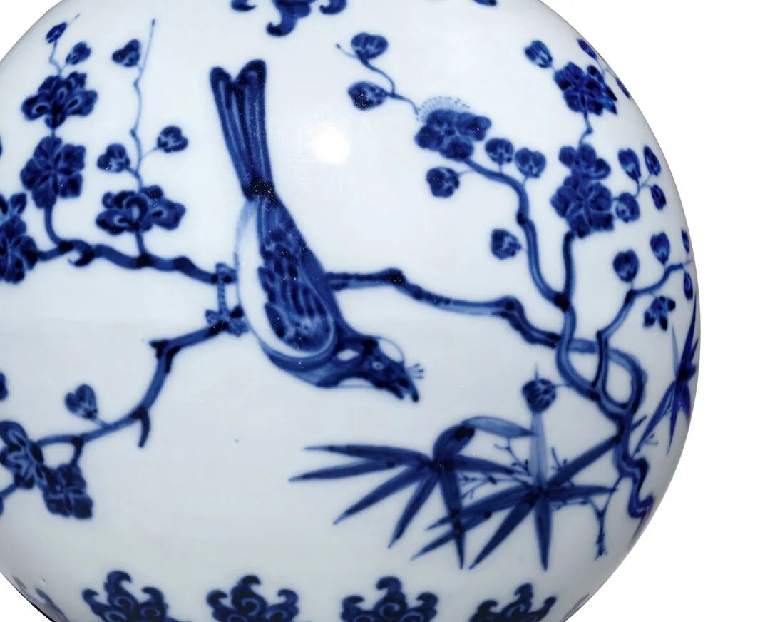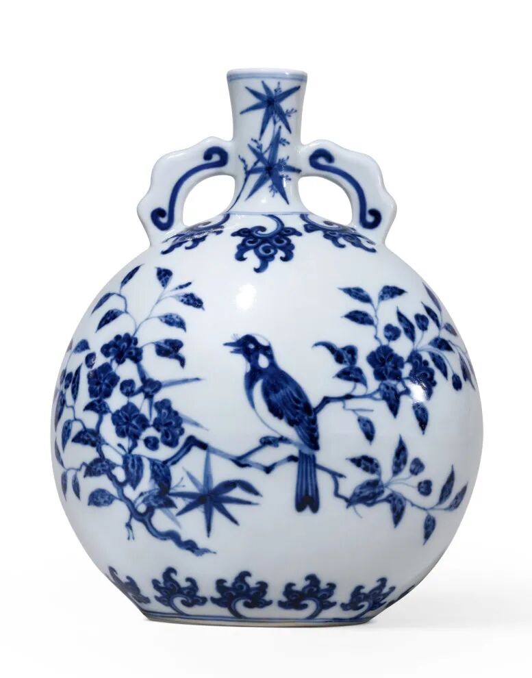 本品小口,直颈,扁圆腹,椭圆形圈足,颈两边饰如意形耳,与肩相连。通体青花为饰,口沿外饰双弦纹,颈绘竹叶纹,肩部及胫部分绘五出叶纹相对应,双耳各饰灵芝纹,瓶身一面绘白头翁鸟栖于盛放的梅花枝头,另一面则饰白头翁鸟栖息于盛放的杏花,前后腹均衬以翠竹。一只仰视其上,一只低头俯视,绘画生动,寓意吉祥。树底生矮竹几丛,枝叶以双钩笔法勾勒,密而有序,极尽工巧。花瓣轻透、娇嫩欲滴,繁盛中更显雅致,呈现一派春光明媚景象。腹上下以缠枝花一周做边饰,所绘青花点染,仿永乐苏麻离青料之铁锈斑效果,施釉肥厚,白中泛青,为雍正官窑仿永乐青花之佳作。