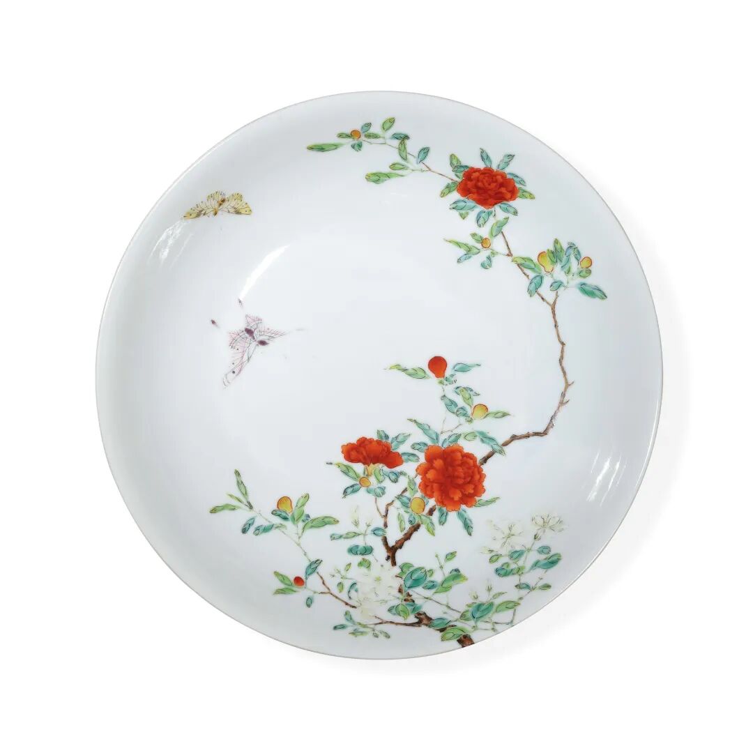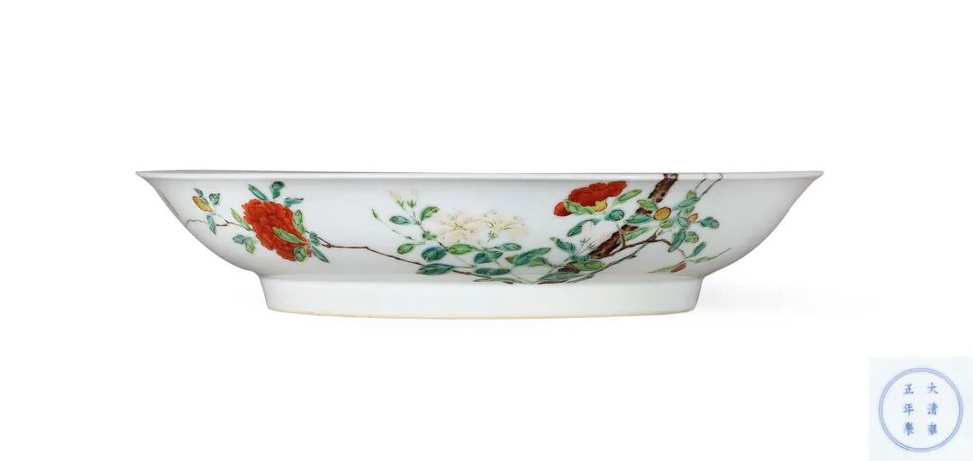 雍正一朝秉承用之,并将其与宋人写实花鸟画之精髓结合而成,遂营造出新的美学意境,由此可见雍正皇帝艺术修养超群,品味独具一格。本品装饰技法名曰:“过枝花”,始见于康熙后期,尤以五彩瓷器为多见,凡运用此法者,皆质量非凡。此技法之应用非一般工匠所能为之,唯有画技出神入化者方能驾驭。开创了清代御瓷的新时代,成就后世不可企及的艺术巅峰,从而令此式过枝花卉盘亦因以画笔精美和布局新巧成为清宫御瓷美学之典范。