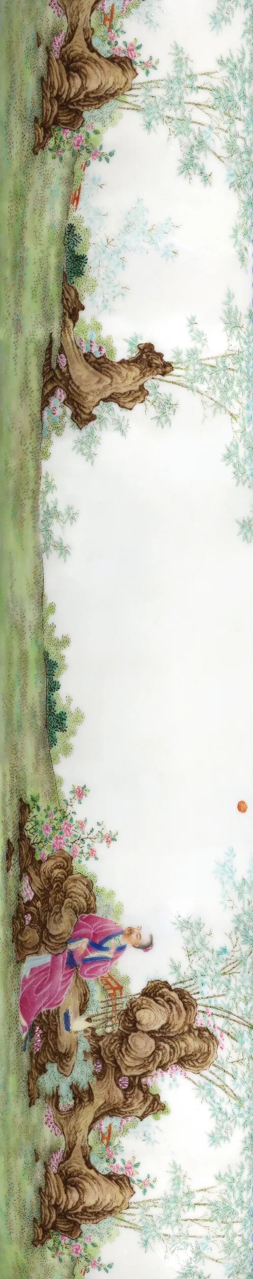 珐琅彩之烧造尤为不易,需于江西景德镇御窑厂拉坯烧制,将制成的素瓷胎,千里跋涉,运至清宫内务府造办处珐琅作,施彩后二次入窑方成。所绘纹样先由宫廷画师设计画稿,在旋好的模型上绘出纹样,经皇帝御览批准后,才由画师用珐琅彩料绘就。每一件都精心设计、细心绘制,尽艺匠之所能,融汇中西方技艺、艺术之精粹,凝结着康雍乾三代帝王殷殷期盼与不倦追求,是王朝之国力的象征。本器以宫廷绘胤禛行乐图为模本,别具一格,既有对技艺的传承与延续,又极富创新性,为难得一见之精品。