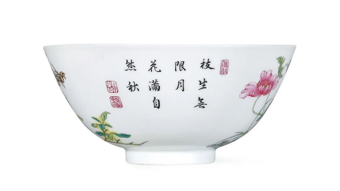 清雍正 瓷胎画珐琅荣华富贵图题诗碗
