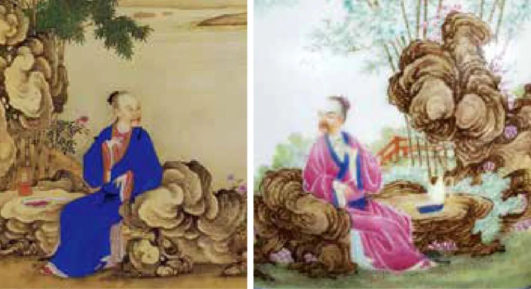 最为相似者,无疑是《岸边独酌》一页。两者画面构图呈对称布局,人物姿态、衣着,乃至山石画法,皆如出一辙。略有不同处如册页中的紫砂茶壶换成了执壶,岸边水面之景改换为庭院内景,细节处用色有别。此件水丞当以此册页为本,略作调整而成。珐琅彩所绘人物虽与雍正肖像略有不同,但深得画中悠远清净之意境,不仅构图形似,更是得其精髓。