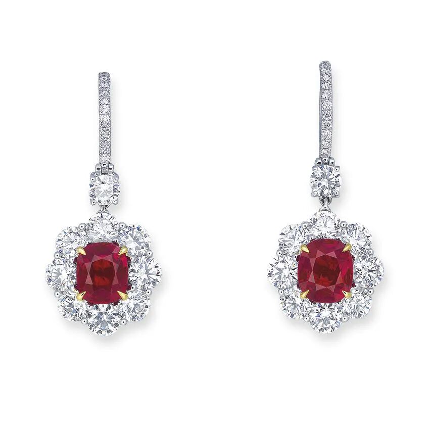 2.81及2.57克拉枕形缅甸天然鸽血红红宝石及钻石耳环