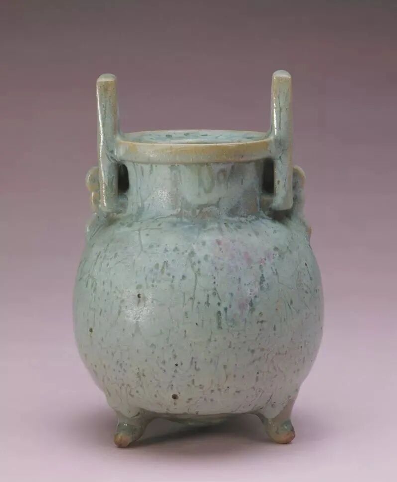 此器造型古朴大方,以釉色取胜,梅子青釉胜于一般青釉,可与翡翠媲美,尤为难得。炉是由商周时期的青铜鼎演变而成,多用作礼器。瓷炉最早始于东吴,宋以前常见的是托炉,宋代开始流行三足炉。炉方唇,短颈,长圆腹,圜(huán )底,底下有内凹的脐心,下承以三乳状足,足外撇。肩部对称置双耳。釉色青灰,饰紫红色斑,釉垂流现象及“蚯蚓走泥”纹均较明显,釉层中气泡爆裂较多。凸棱及釉薄处呈浅褐色。内壁釉层开片较多,玻璃质感较强。
