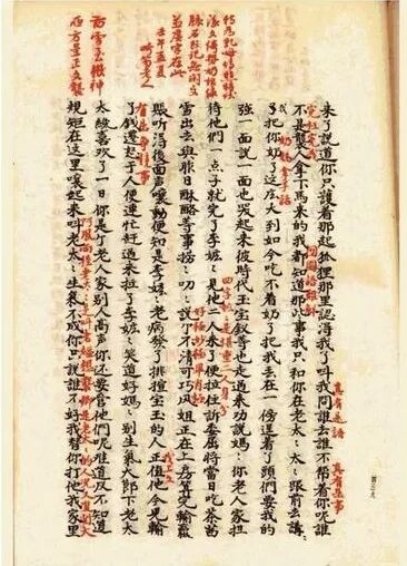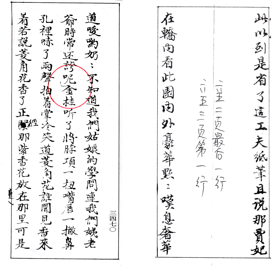 再看已经分了回的版本,恰巧最后两回的分回就在这里。以庚辰本为例,七十九回的结束句是:“连我们姨老爷时常还夸呢,欲知后事且见下回”。八十回的开头是“话说金桂听了将脖项一扭”,把“欲知后事且见下回”和“话说”这些套话去掉,把上一回末句同下一回的首句连起来,正好同列藏本画的记号处的文字完完全全的一样,这不正好证明了我以上所推测的按页分回的论述吗?!