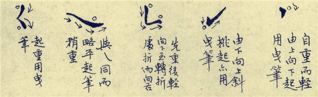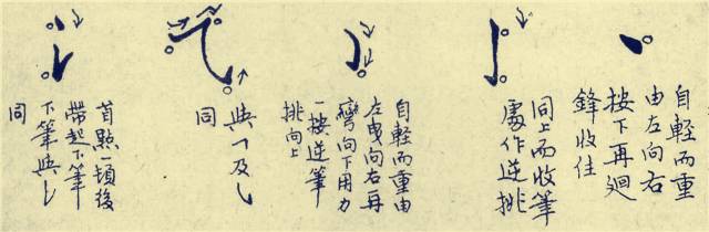 2、带下点 是指上下两点一笔带下,如“淤”(于)字。写法是落笔写上点,用力顿一下,再提笔写下点,最后再用力顿一下,迅速勾出。上点略侧,下点稍平,上下点之间,用一细细的牵丝相连。使上下连贯、粗细分明,有形态、有动势。