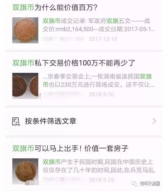 举个最常见的例子,关于民国双旗币的文章铺天盖地。只要你去网上搜索相应的关键词,就会出现诸如“双旗币能值上百万,最低都要十几万”、“双旗币能换一套房”的奇葩言论。