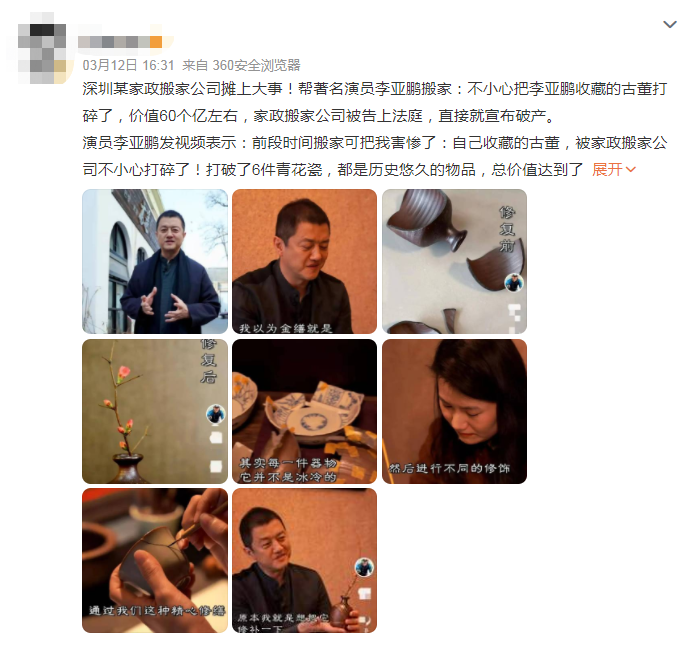红星新闻《搬家公司打碎李亚鹏价值60亿的古董“被破产”?工作人员:假的》