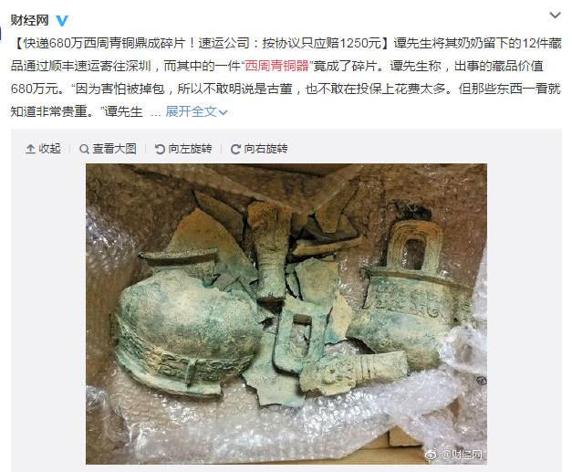 “2017年4月,一位来自湖南攸县的谭先生通过顺丰向深圳的王先生快递了12件文物,价值过亿。结果等开箱验收的时候发现其中一件价值680万元的西周青铜器——夔龙纹双耳三足圆形鼎青铜器已经被完全损毁,成了一堆碎片。顺丰方面就此事回应称,谭先生所寄物品属于禁止快递物品,鉴于发件时有保价3万元,如能提供相关权威价值鉴定报告,顺丰方面可赔偿3万元。”