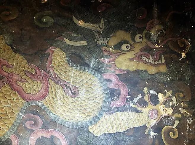 虽然时间上它晚了70年,但也是明代中期的作品,距今已有500多年的历史了。在承恩寺天王殿内,现在保存有6幅壁画,规模不大,但壁画的技法、风格等几乎和法海寺壁画完全一致。从技法上看,和法海寺壁画一样,为了让画面具有立体感和金碧辉煌的效果,不惜重工,采取了「沥粉和贴金」两大绝技,制造出一种「裸眼3D」的效果。