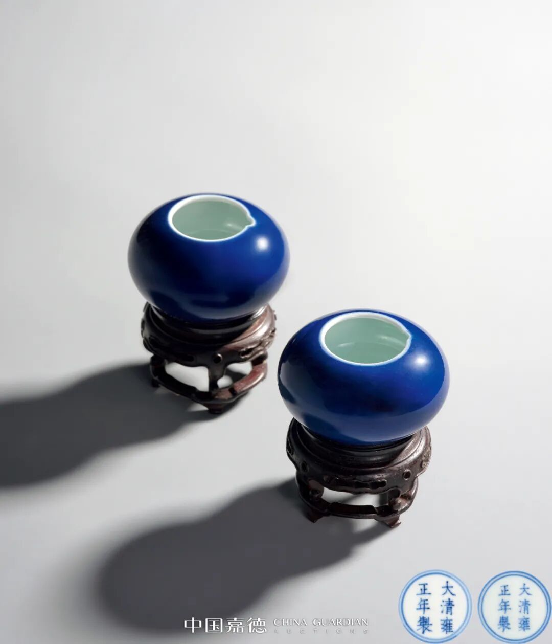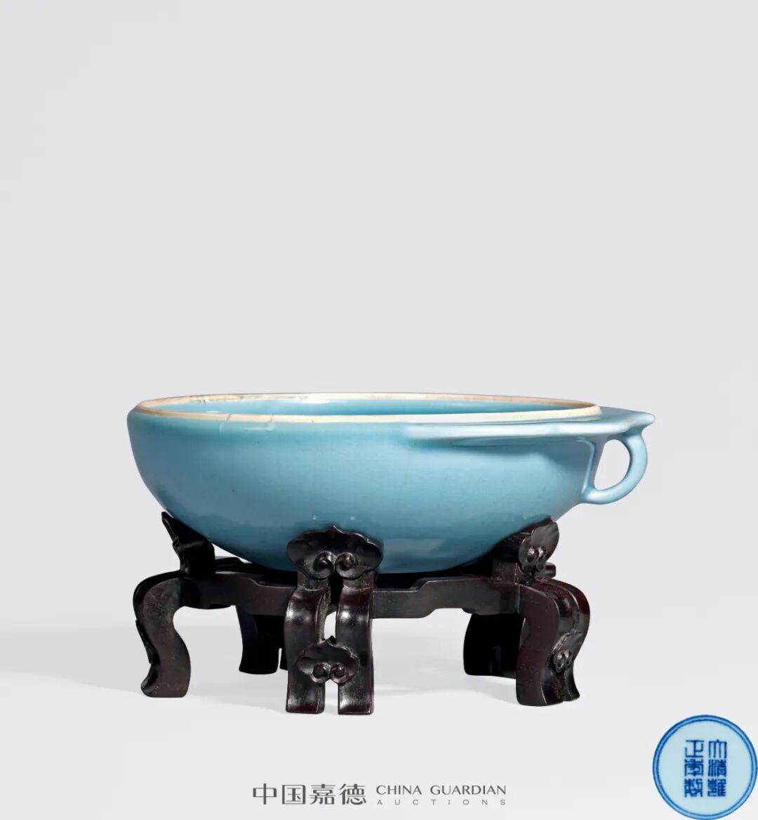 清雍正厂官釉如意耳尊造型端庄古朴,器身光素不事雕饰,风韵隽永。与本品釉色相同的,仅见台北故宫博物院藏有一例,存世稀罕,以713万元成交。清雍正蓝釉水丞一对造型精致隽永,品质极佳,成对流传近三百年,殊为不易。其不仅是雍正皇帝亲自督促下烧制的御用文房佳器,还是后世收藏大家“暂得楼”主人胡惠春先生珍藏。能递藏暂得楼之作品,是每位收藏家可遇而不可求的梦想,经过激烈竞拍,终以690万元成交,结缘新藏家。明早期钧窑玫瑰紫釉鼓钉洗出身显赫,质精式雅,备受世人珍视,以644万元成交。