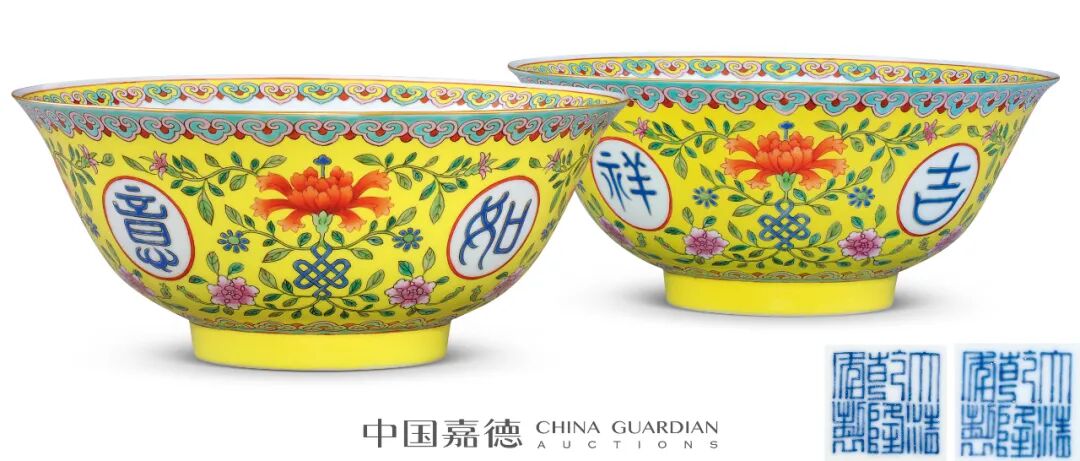 清乾隆 黄地洋彩“吉祥如意”大碗一对