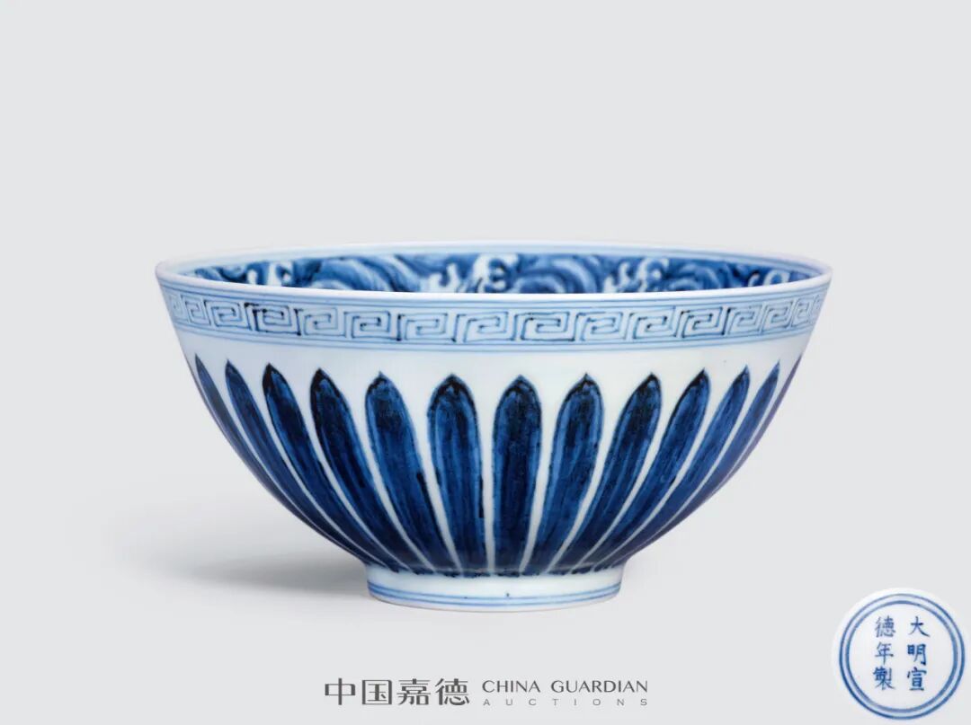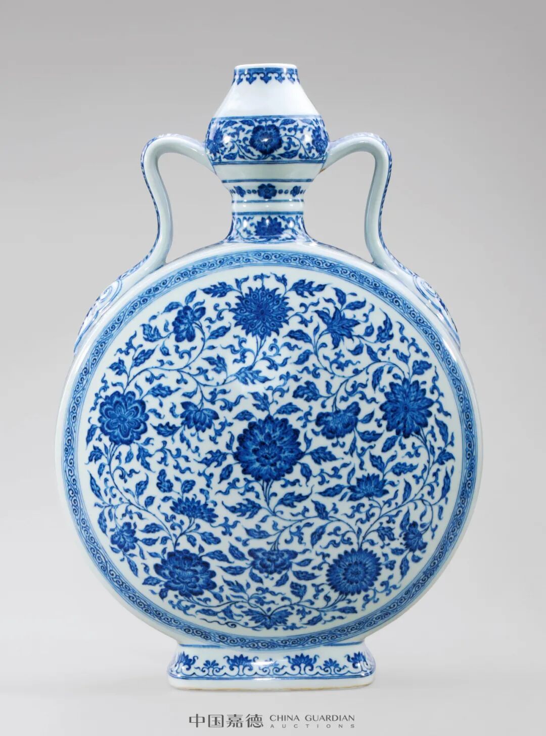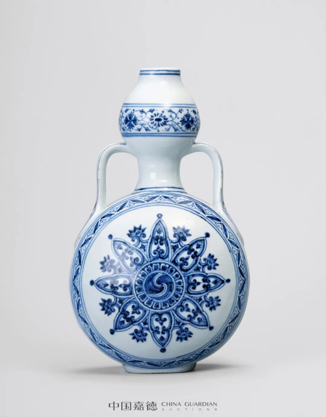 清康熙青花团花锯齿纹摇铃尊是嘉德的“老朋友”,为中国嘉德2012年春拍瓷器专场封面作品。此次回“嘉”,以1000.5万元的成交价再得知音。明永乐青花轮花绶带耳葫芦扁瓶曾为二十世纪收藏中国金银器与白釉瓷器历史最为悠久之西方收藏家卡尔·坎普先生(Johan Carl Kempe)珍藏,此次上拍,以667万元善价成交。明宣德青花缠枝花果莲子碗曾为英国藏家旧藏,此次以310.5万元成交。