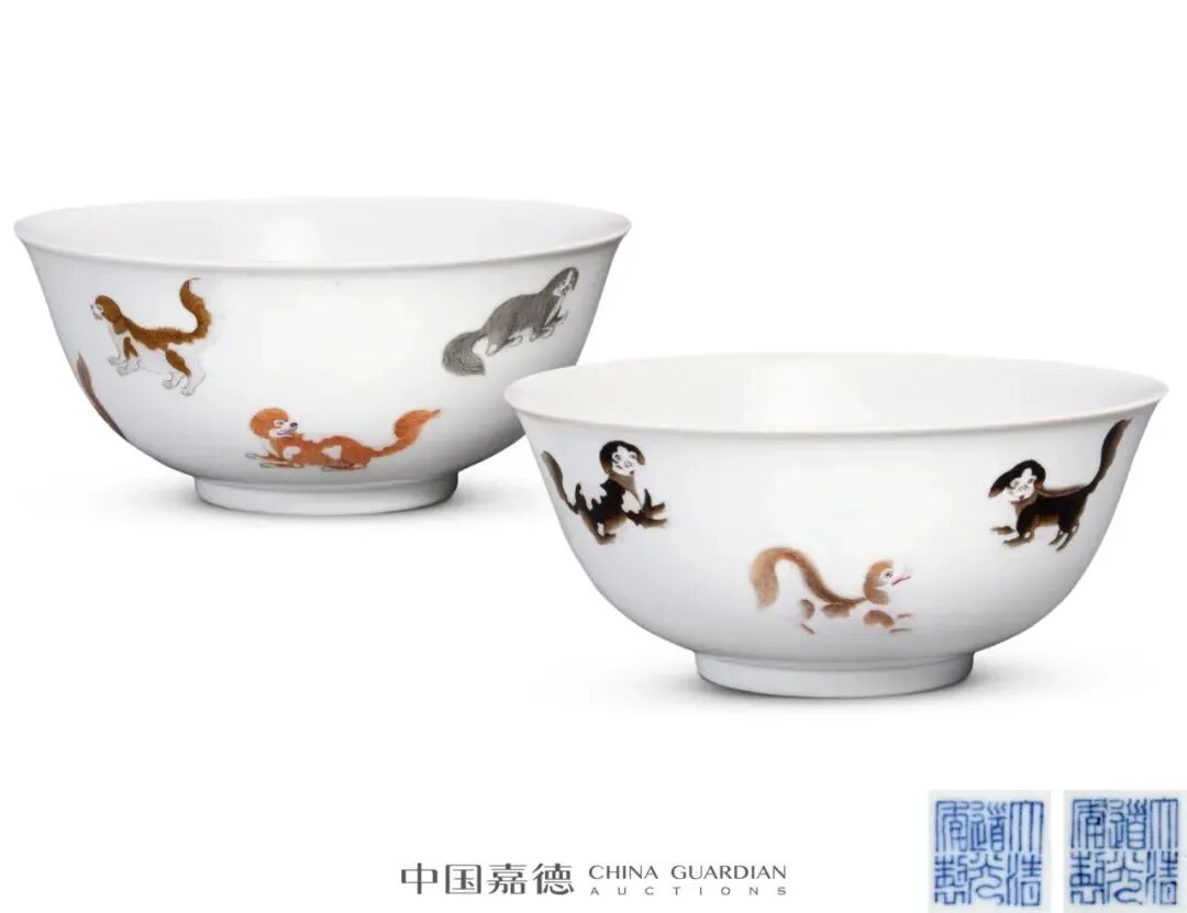 青花、粉彩成为场上热点,元青花缠枝花卉纹兽耳罐以109.25万元成交,清道光青花缠枝莲纹铺首尊以105.8万元成交。两件粉彩佳品,清道光粉彩西洋犬纹大碗一对、民国胭脂红地粉彩福寿连绵图如意耳衔环镂空转心葫芦瓶一对均以92万元成交。