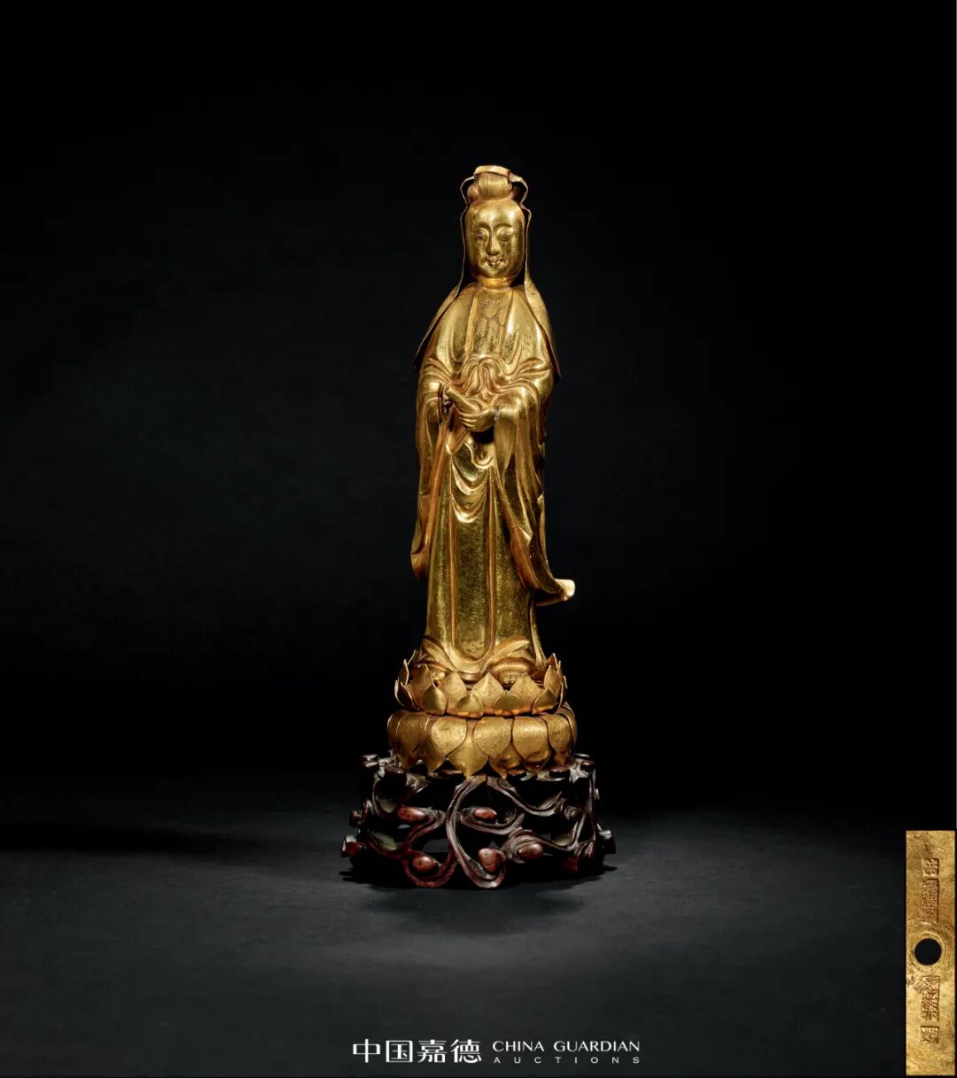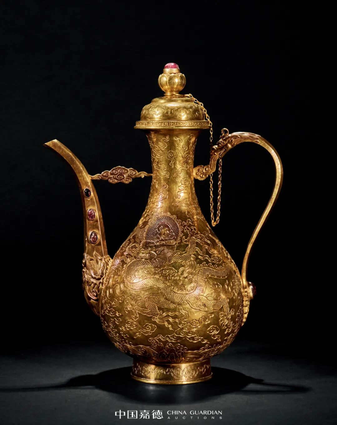 明代金质龙纹嵌宝石圆壶出自宫廷内府,材质高贵、做工精美、图案规格极高,终以563.5万元成交,独占鳌头。清代银质局部鎏金百寿纹“大清乾隆年敬造”五供,材质奢华,寓意祥瑞,别致精美,以126.5万元成交。清代金质净瓶观宝相庄严,制作精良,以69万元成交。
