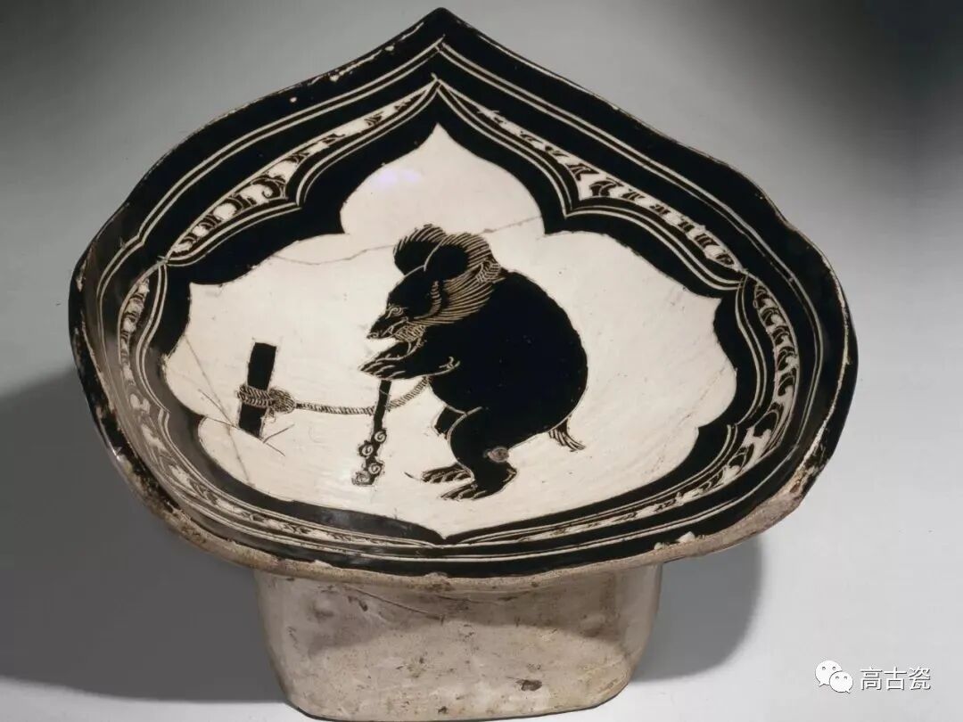 在这件瓷枕枕面中央是一只跳舞的亚洲黑熊,拴在一根木桩上。中国东北地区为亚洲黑熊分布地区之一,观看狗熊表演是当时一项非常流行的娱乐活动。
