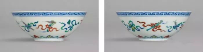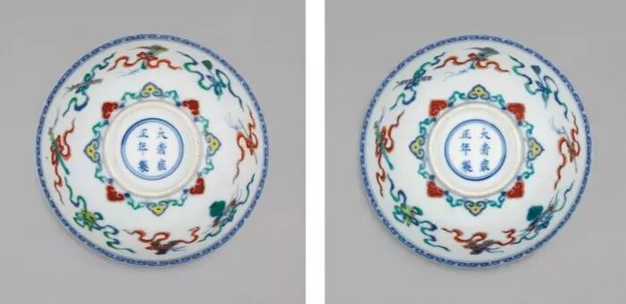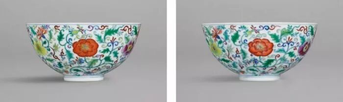 比較一對例,現藏於東京梅澤記念館,曾展於《清朝陶磁》,MOA美術館,東京,1984年,編號39。另一例出自 Brian S. McElney 收藏,曾展於《Porcelain of the High Qing 1662-1795》,Art Gallery of Greater Victoria,維多利亞,1983年,編號78。再比較一例,載於《世界陶磁全集》,東京,卷12,圖版30。此類盌亦有售於拍賣會:倫敦蘇富比1972年2月29日拍出一盌,編號247;還有一盌售於倫敦佳士得1978年12月11日,編號52;再參考兩盌,分别售於倫敦蘇富比1969年11月4日,編號107及1996年6月11日,編號100。尚有一對盌例,紋飾相近,枝蔓以釉下青花為主,釉上彩顏色較淺,售於香港佳士得1992年9月29日,編號563。