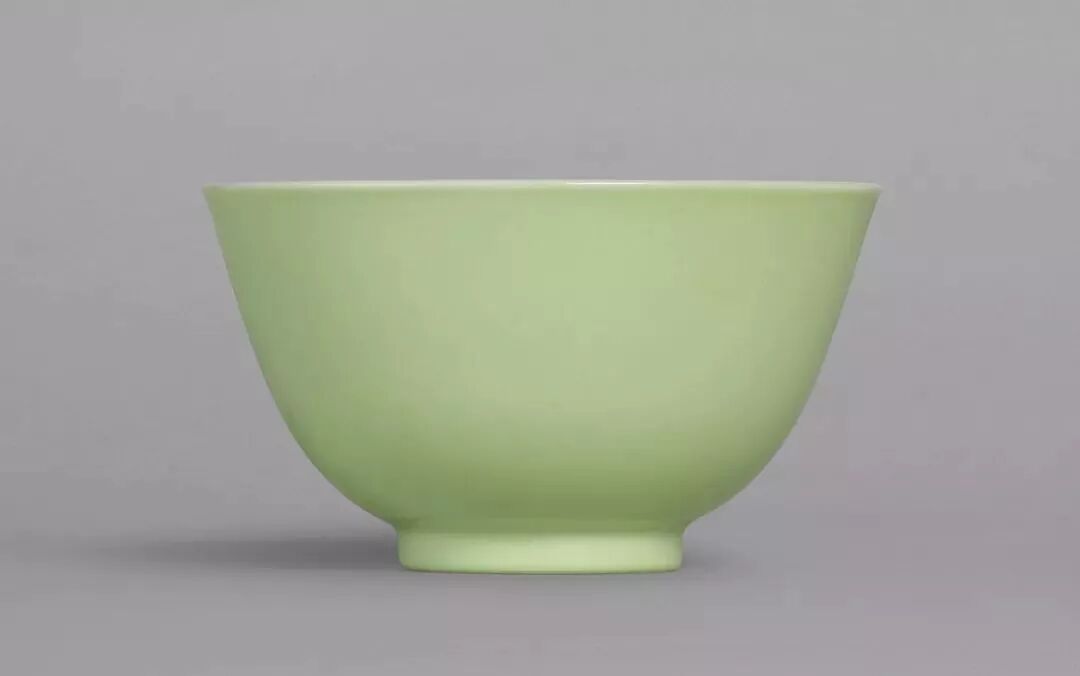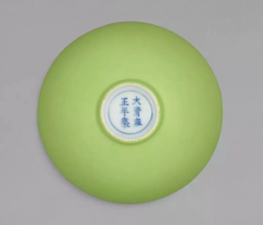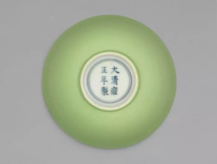 青綠或為雍正朝最罕見的釉彩,其光潤勻稱,讓人讚歎。青綠釉彩乃以低溫燒就,是以此色彩瓷必經複燒,發色純粹如此盃者甚為難得。參考台北故宮博物院藏兩例,其一出版於《故宮清瓷圖錄.康熙窰.雍正窰》,東京,1980年,圖版153,另一例曾展出於《青代單色釉瓷器特展》,台北,1981年,圖版44。另見一對盃,收錄於《五色晚霞:竹月堂藏元明清一道釉瓷器》,香港中文大學文物館,香港, 2005年,編號113。
