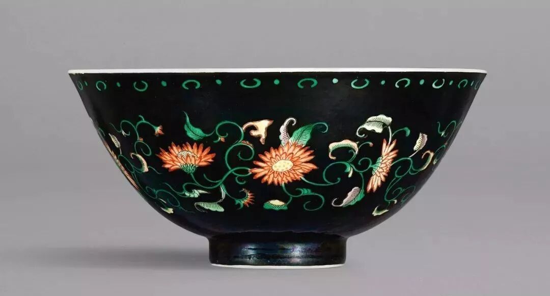 墨地彩瓷,早見於十五世紀中葉,但數量極少,當時藝匠在含鉛量高的銅綠彩上添鈷青,燒製時兩者融為一體,形成光滑黑釉。及至康熙年間,復興墨地彩瓷,配以五彩之色,如布倫戴奇舊蓄一對墨地纏枝花卉紋盌,現藏於三藩市亞洲藝術博物館,圖見博物館官方網站,編號B60P1742和 B60P1743。