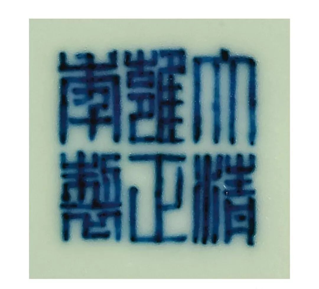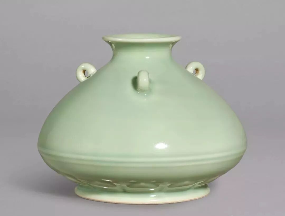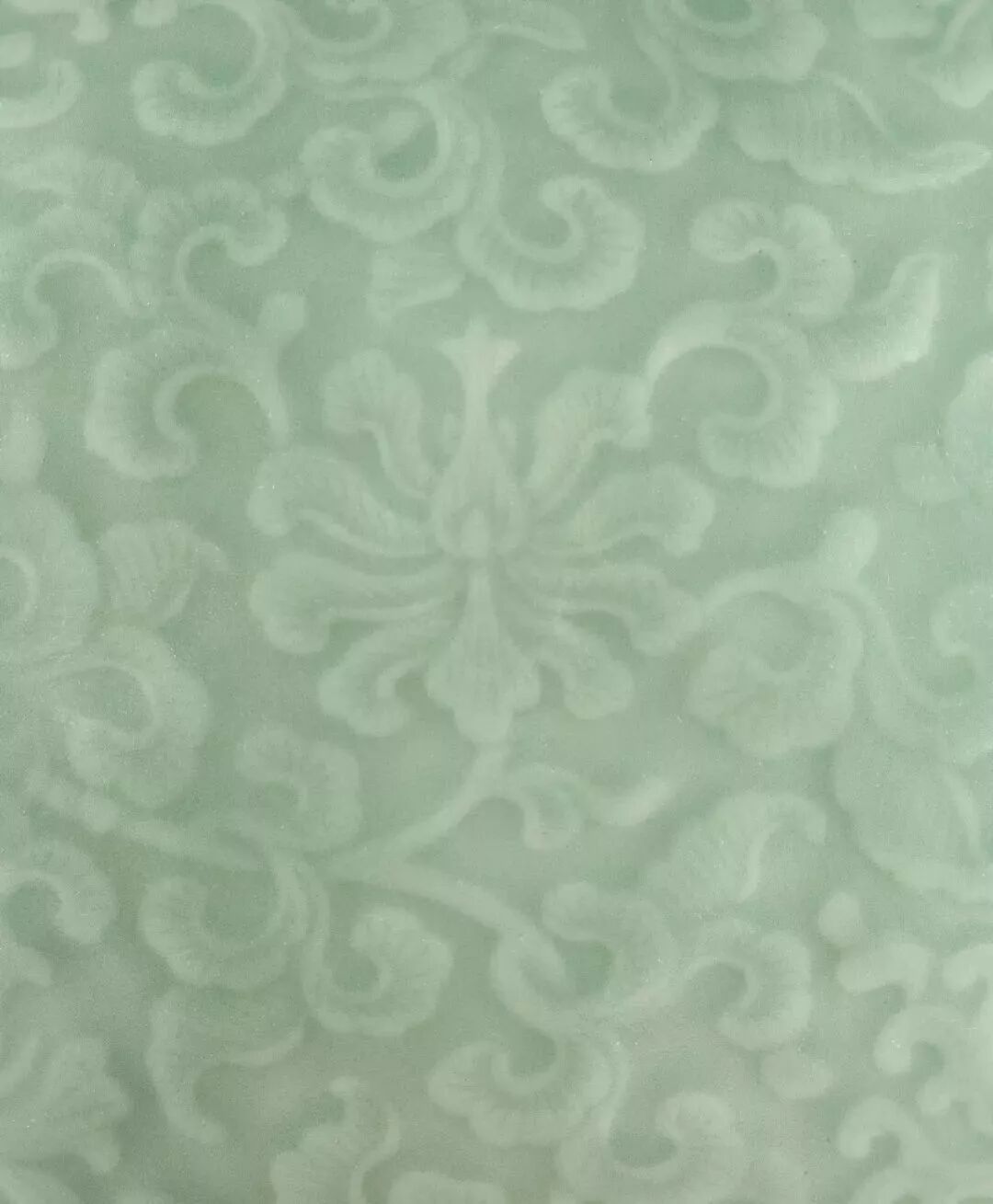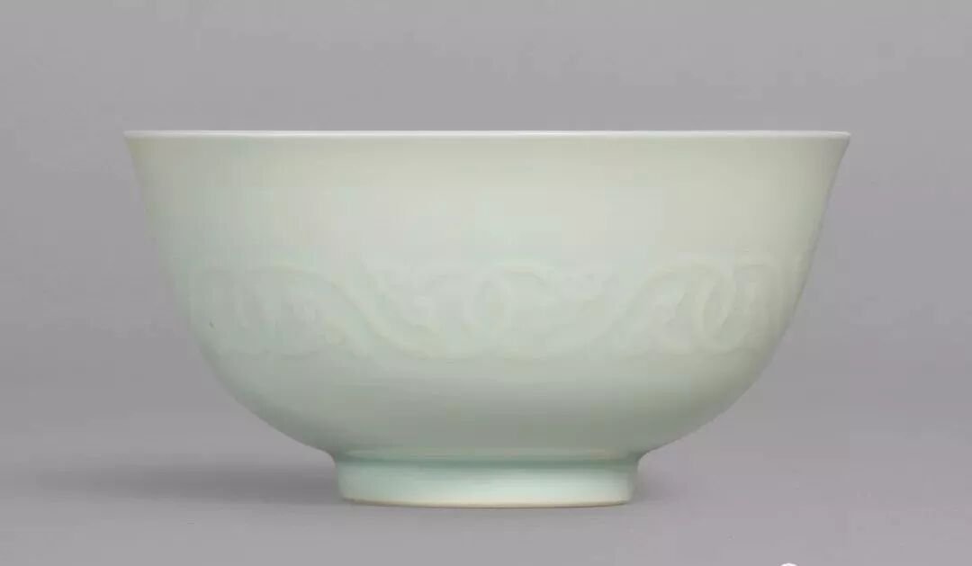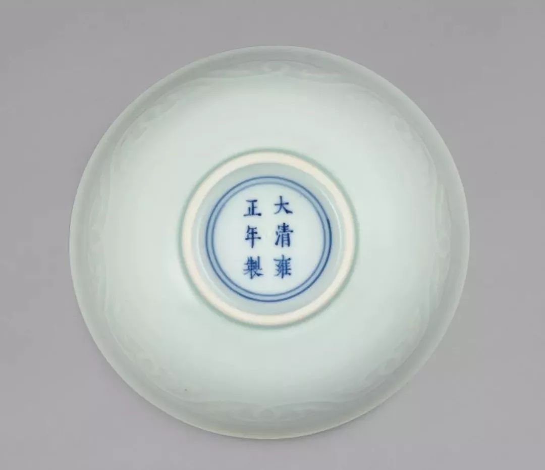 此品青釉意啟明朝龍泉窰器,創燒於康熙,雍正繼而善之,窰工篩減宋代龍泉釉中鐵質,技法日臻精熟,遂見本品青釉澈淨明潤。雍正帝選以景德鎮瓷胎呈現青綠色釉,瓷胎潔白勻淨,較龍泉厚重粗胎更能映襯青釉澈淨明潤,乃得如斯水瑩青釉。此外,本品浮雕紋飾,凹凸有致,青釉映襯層次分明,意趣盎然。
