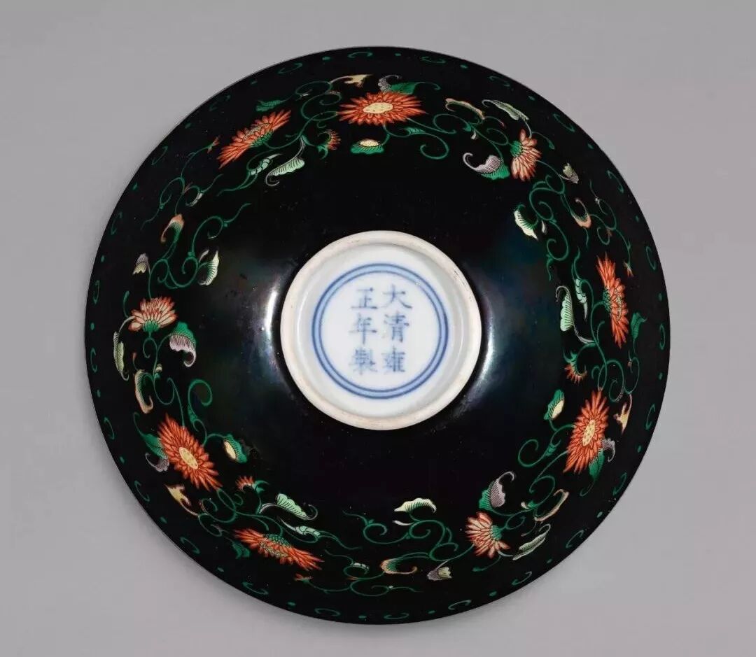 清雍正 墨地五彩纏枝菊花紋盌 《大清雍正年製》款