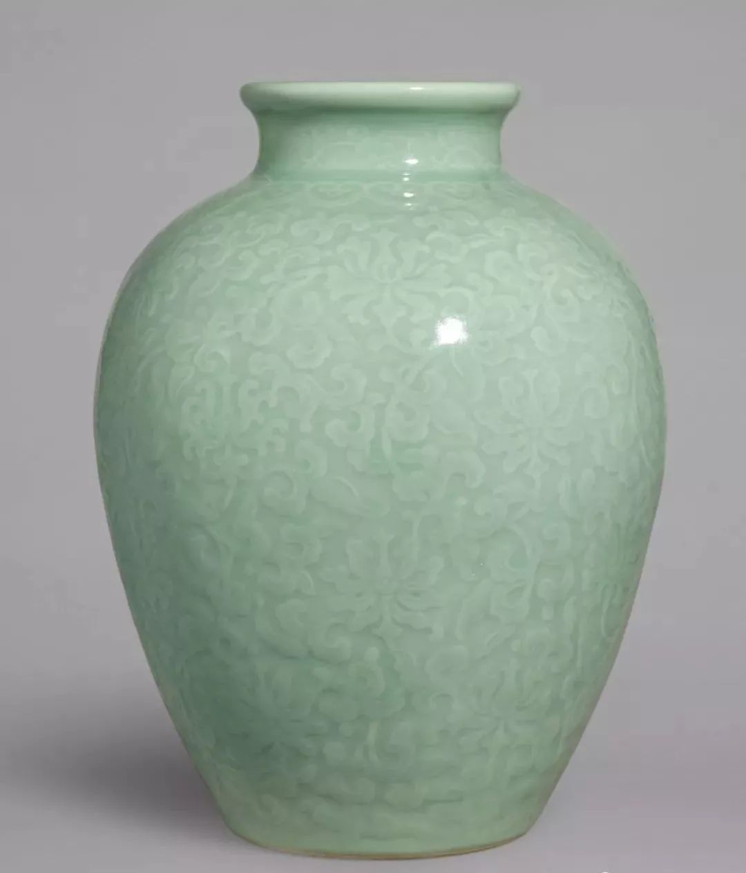 不僅遵循明規,陶匠創思出新,此件粉青釉蓮紋罐且蘊乾隆風韻。此罐在明代器形的基礎下延展變化,曲線更形修長典雅;蓮紋優雅細膩,有別於明朝雛本。承襲前人之風,乾隆帝選以景德鎮瓷胎呈現青綠色釉,瓷胎潔白勻淨,較龍泉厚重粗胎更能映襯青釉澈淨明潤,顯出紋飾鮮豔剔透。此外,窰工篩減宋代龍泉釉中鐵質,乃得如斯水瑩青釉。