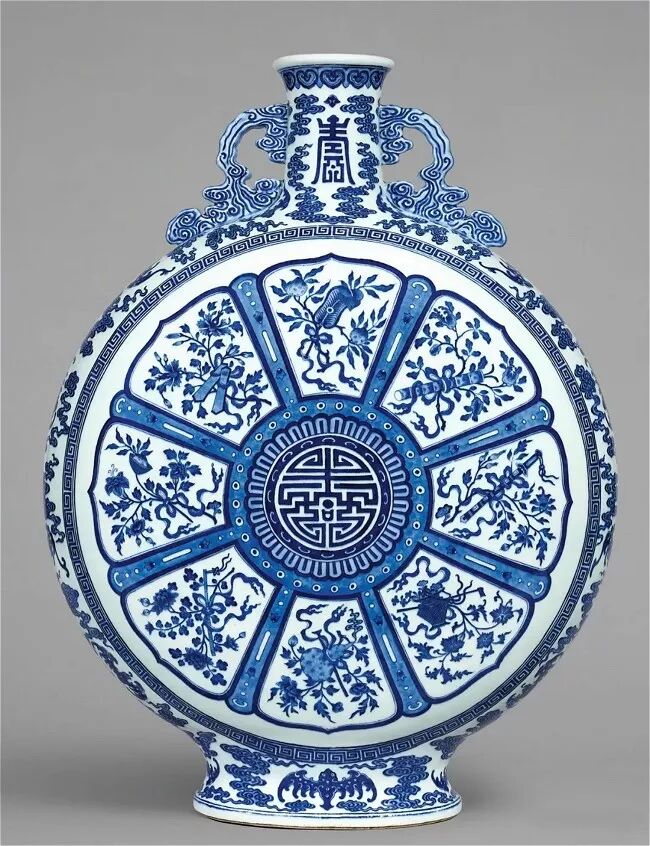 青花扁壺端麗大器,華貴雍容,珍稀罕有,氣勢非凡,乃乾隆御窰登峰造極之作。