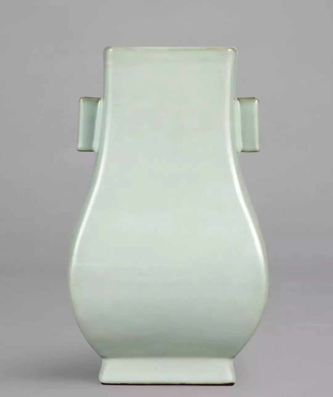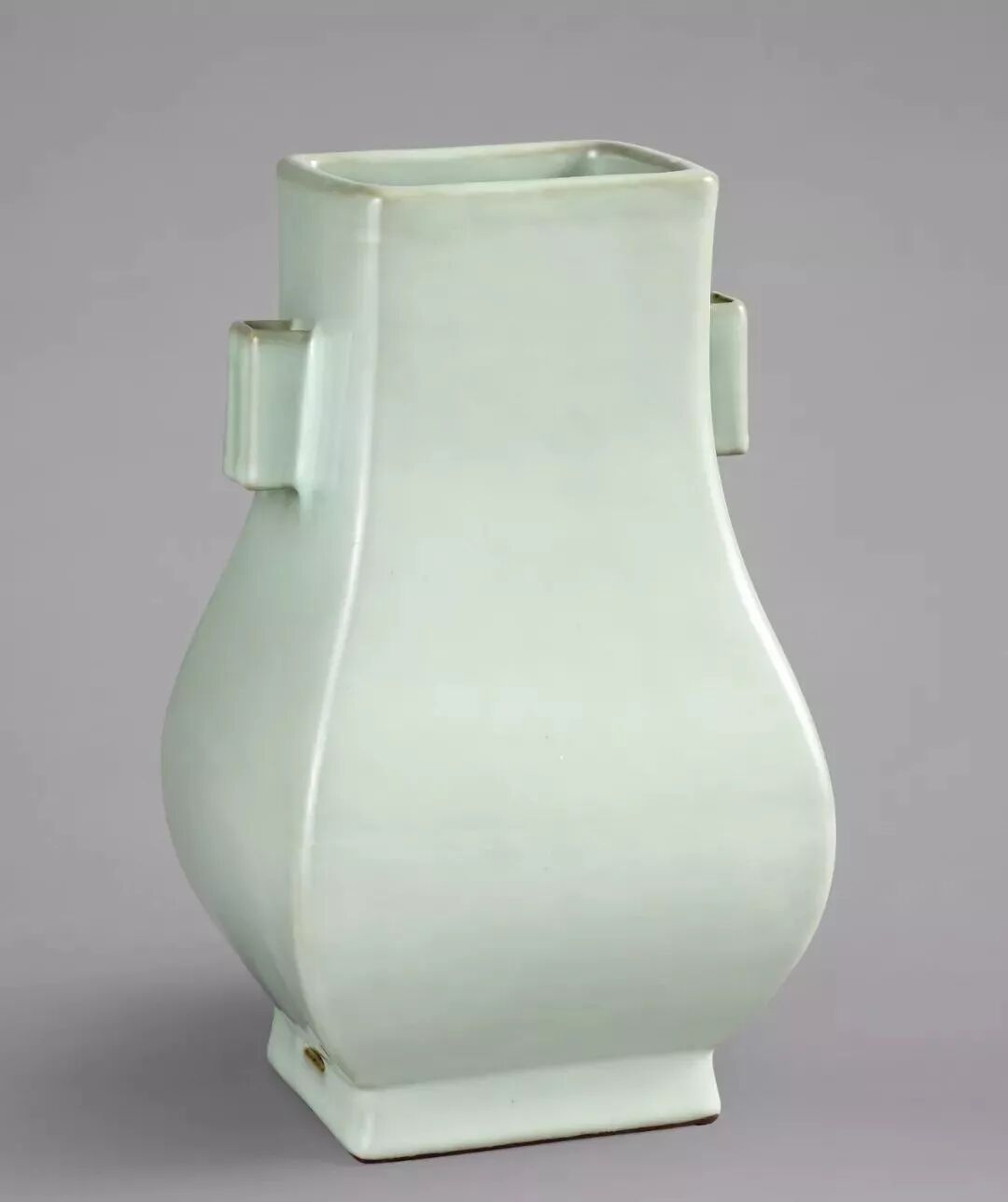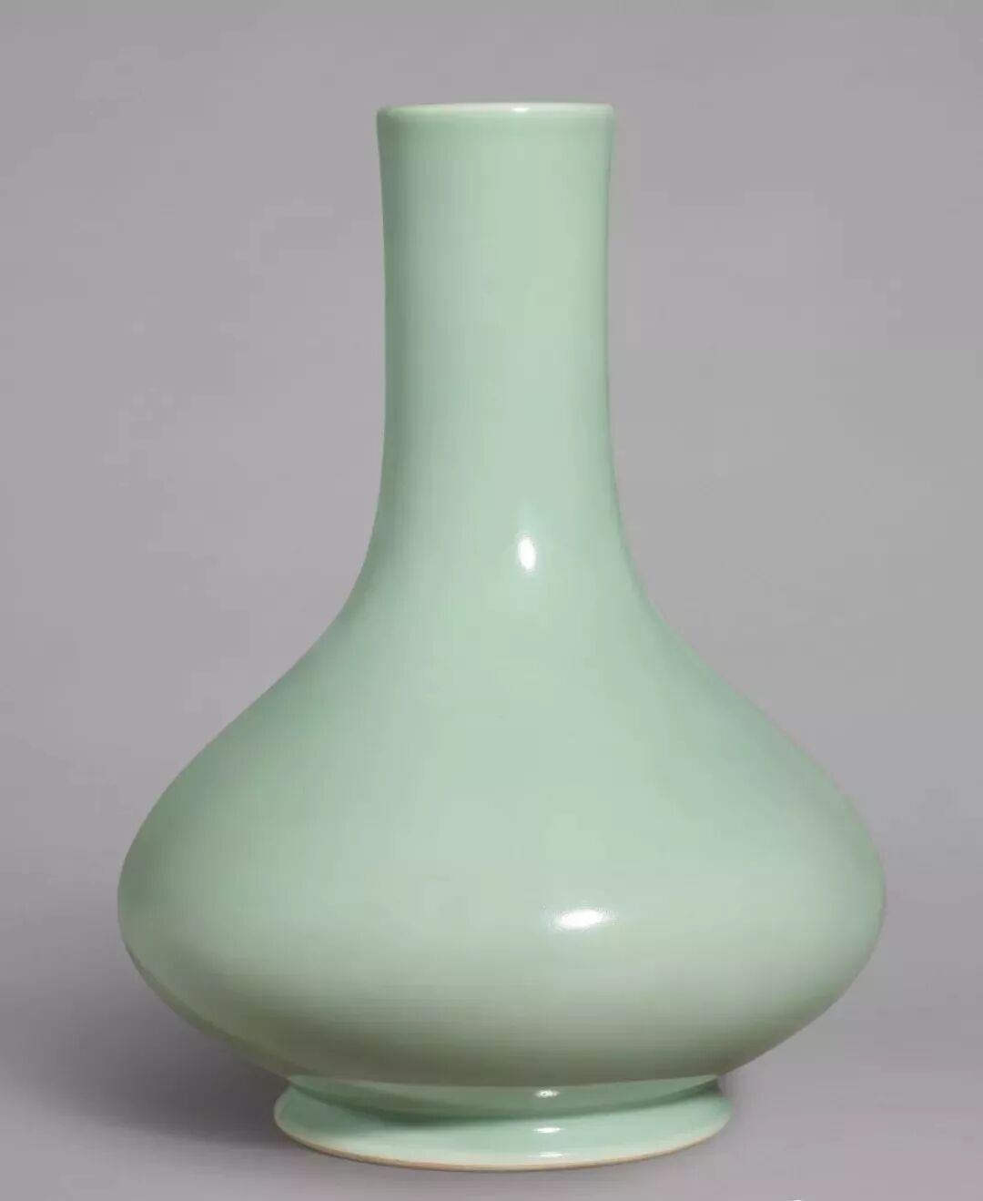 此瓶釉色光華瑩潤,所施仿宋青釉,足顯清代帝皇慕古雅意,亦見御窰為迎合聖意之創新技術。窰工篩減宋代龍泉釉中鐵質,乃得如斯水瑩青釉。此品之青釉創燒於康熙,雍正繼而善之,技法日臻精熟,遂見本品青釉澈淨明潤。