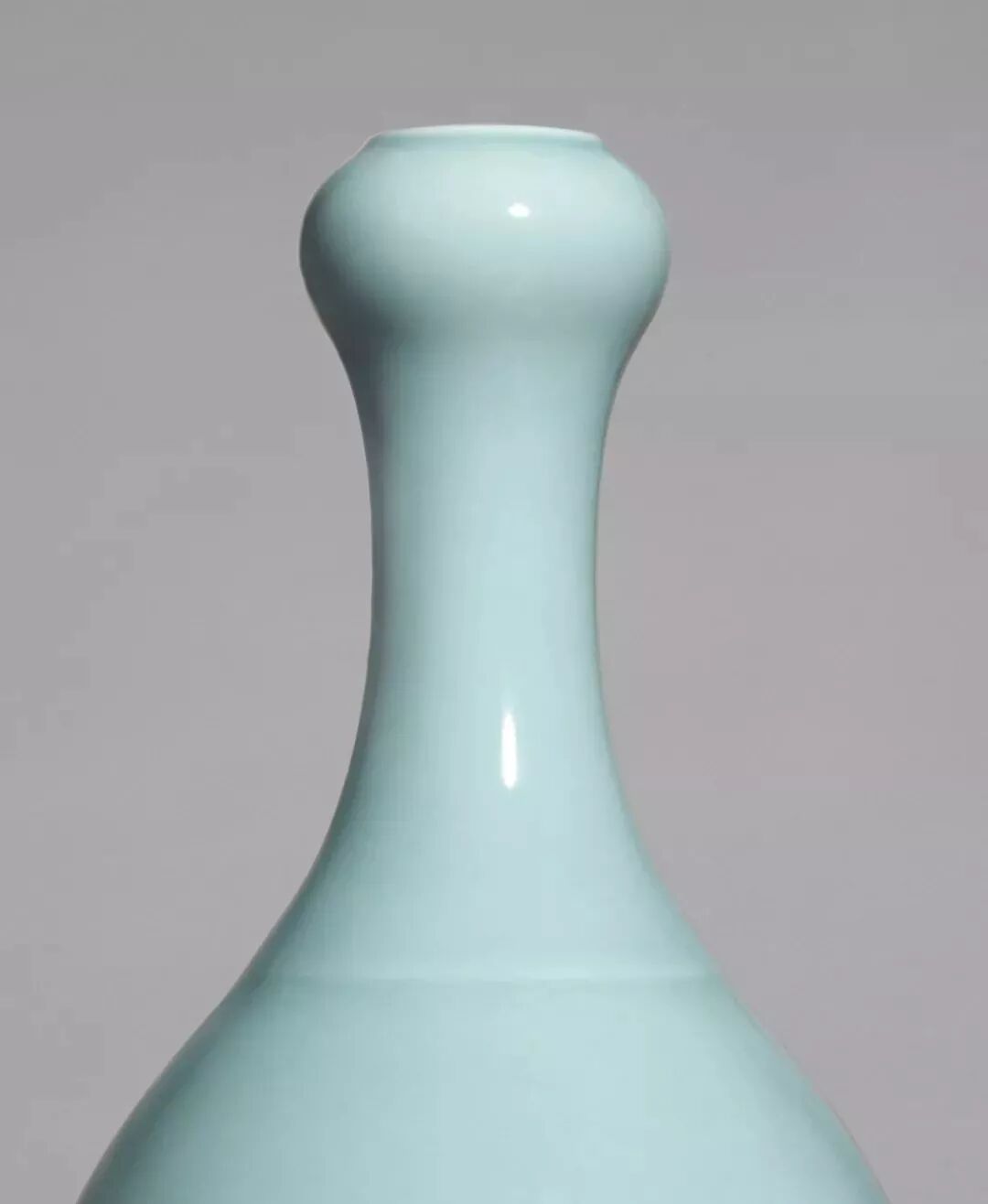 單色釉瓷,看以為易,實則尤艱,嚴苛匠人純青造詣,精準細密,拉坯燒製,繼而吹釉,即通過竹筒,蒙以細沙,必須一絲不苟,才得此輕盈均勻之色。