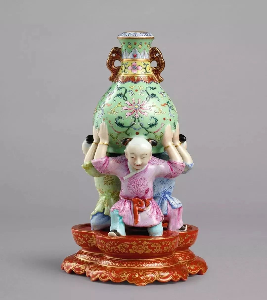 此器比例布局,雅致大方,盡顯心思。上部松綠地番蓮小瓶,雙耳摹古,頸肩華飾,精緻入微,不亞洋彩鉅作。中下部塑貼三子,頭束雙髻,眉清目秀,臉頰飽滿,身穿華衣,袍服圖案各異,粉紅的是牡丹、淡綠的是瑞果、淺藍的是小花,以顏色不同的褲子搭配,醒目鮮明。更加添仿漆木描金蓮紋座,底署描金六字篆書款,誠當朝像生瓷器中之精品。