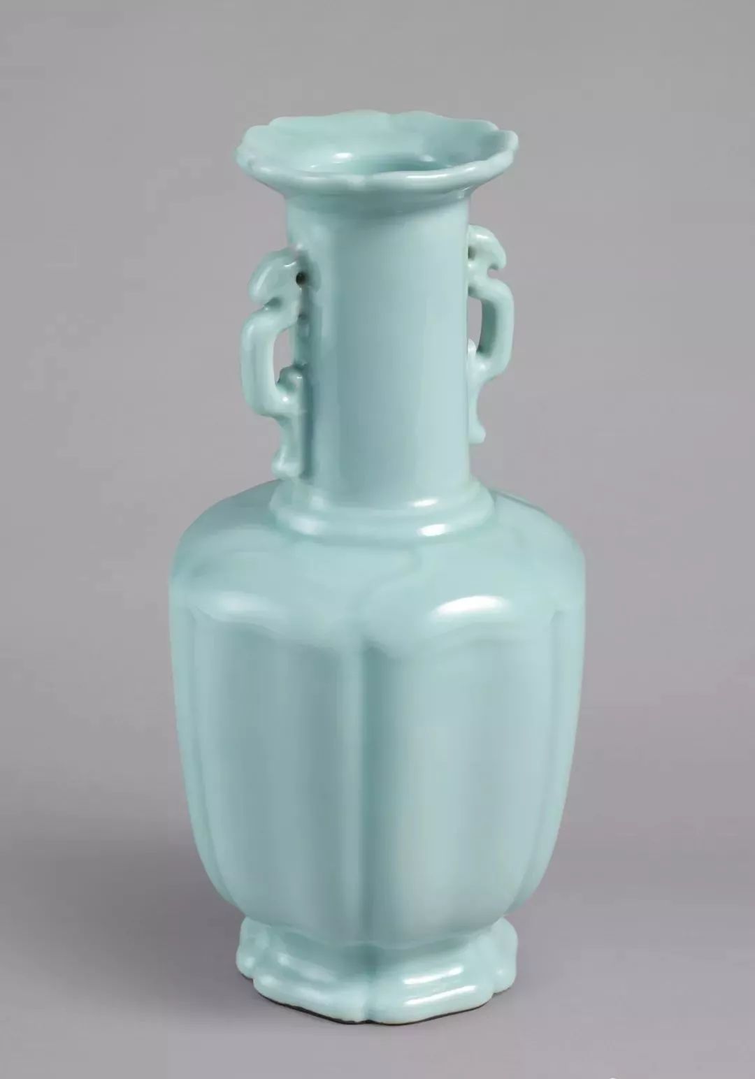本品亦屬唐英所造新式官瓷,器形取材南宋浙江龍泉窰紙槌瓶。龍泉例見康蕊君,《玫茵堂中國陶瓷》,卷1,倫敦,1994年,編號570。以古為本,添以平肩、直頸、雙耳造形簡化,葵瓣式主軸連貫全器,更顯新穎,施以豐厚青釉,溫潤瑩輝,傚擬宋代官窰,秀麗迷人。
