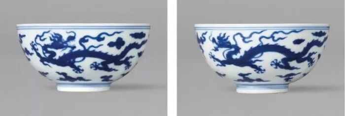 此類青花盌,盡致詮釋明式龍紋,成對燒造。比較三對相似盌例,分別售於香港蘇富比1989年11月14日,編號87、1995年5月2日,編號66和1997年4月29日,編號614。雍正皇帝想必對此龍紋甚為鍾愛,時也有製相類折腰盌。參考一例,載於《華光艸堂珍藏清代瓷器》,香港中文大學文物館,香港,1973年,編號59。另一對為利國偉爵士舊藏,售於香港蘇富比,2018年10月3日,編號145。