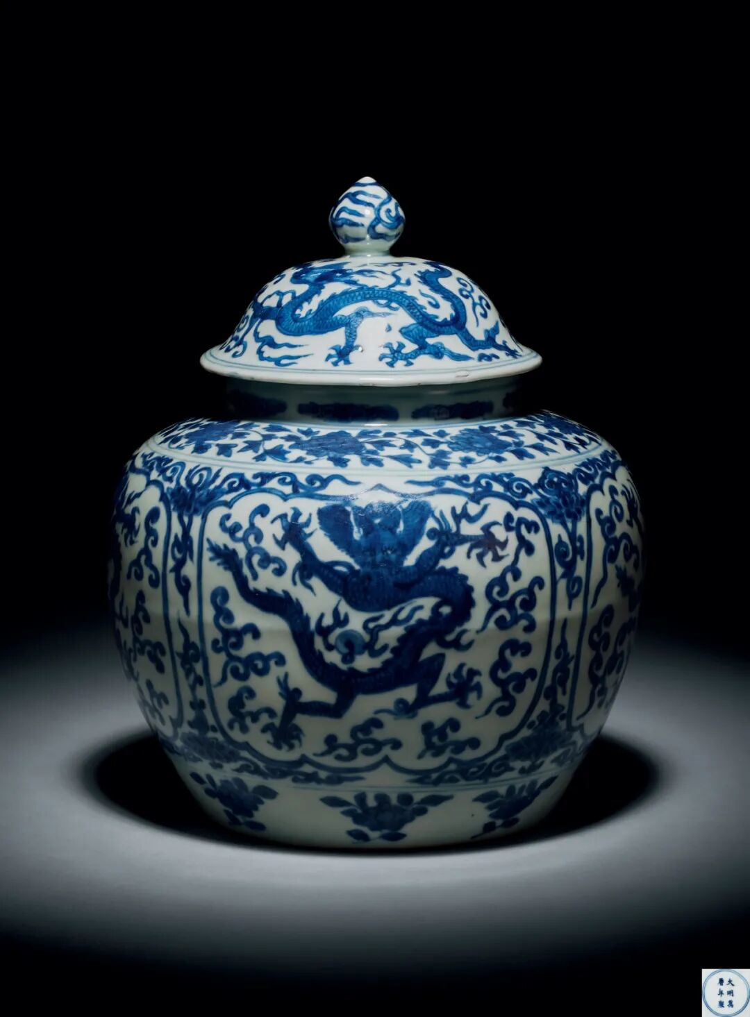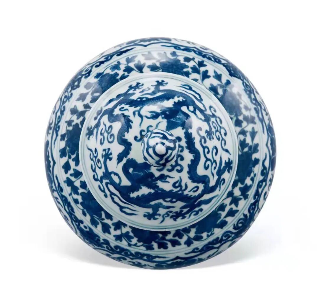 比较特别的是本品为少数原盖尚完好保存的万历大罐,目前所见万历龙纹罐带盖者唯见此器。此盖盖顶为宝珠钮,饰以青花火焰纹,盖身绘双龙火焰纹,整体呈现双龙戏珠之构图,灵气十足。