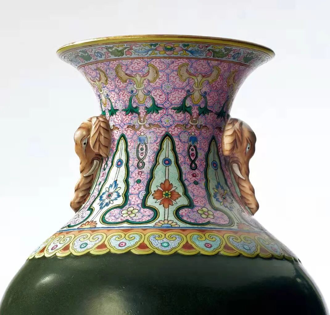 与此器物相似的洋彩加单色釉组合尚有一对可供参考,均为洋彩加炉钧釉器身的双象首瓶,也是为转心瓶和非转心瓶版本各一,十分有趣。