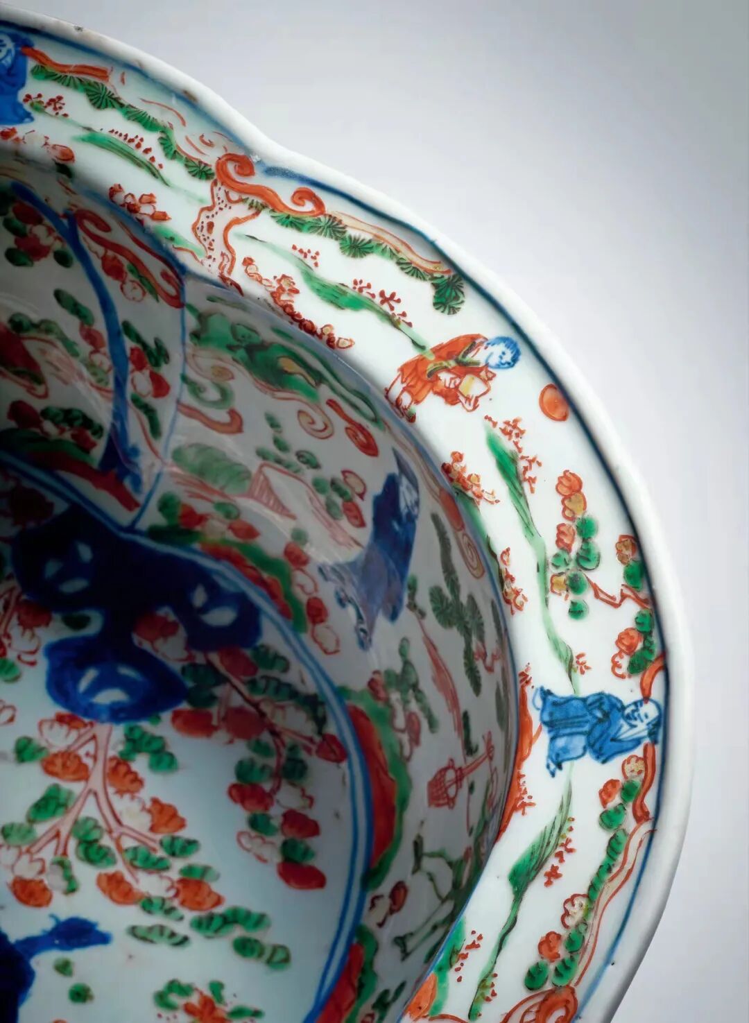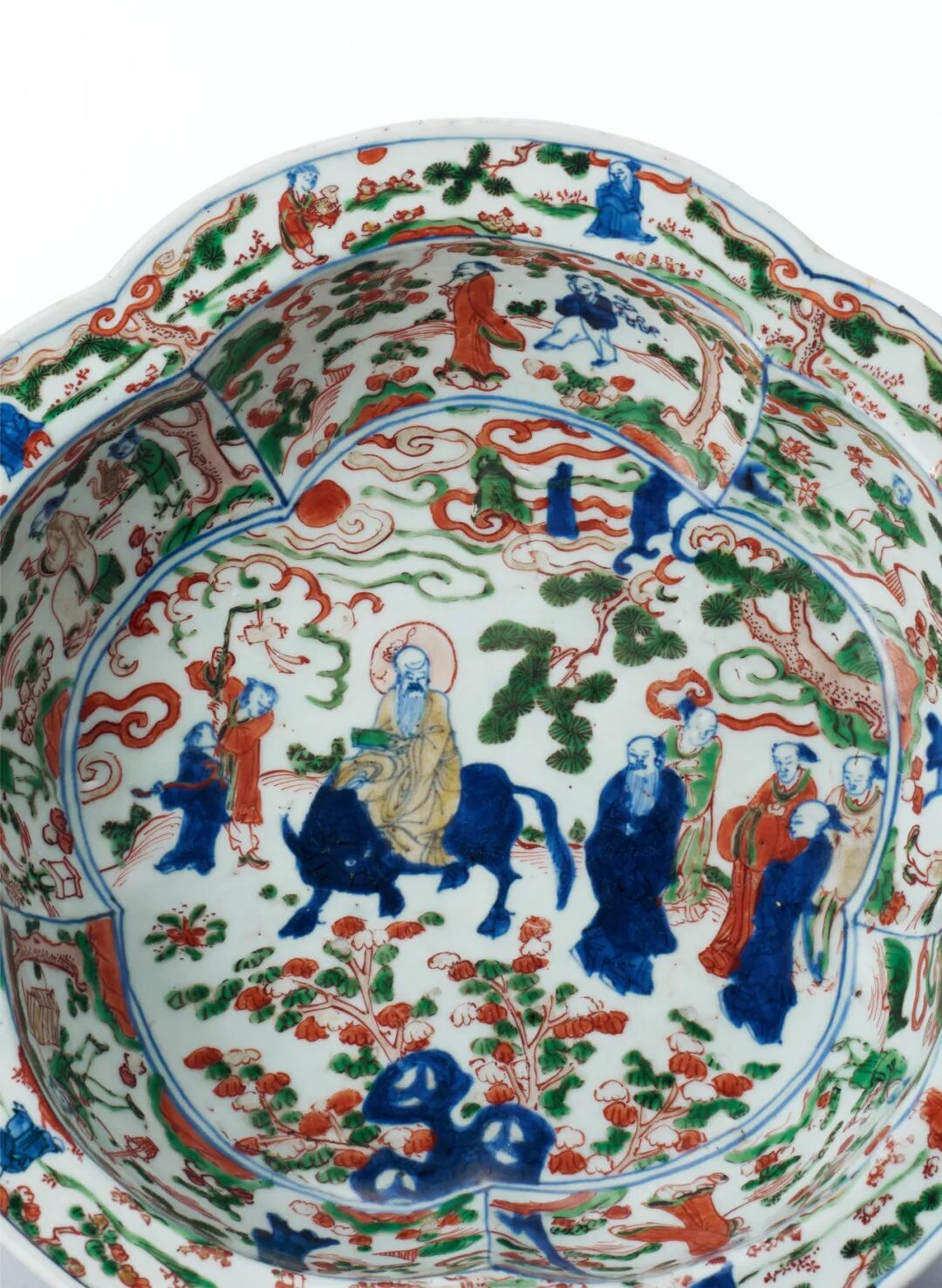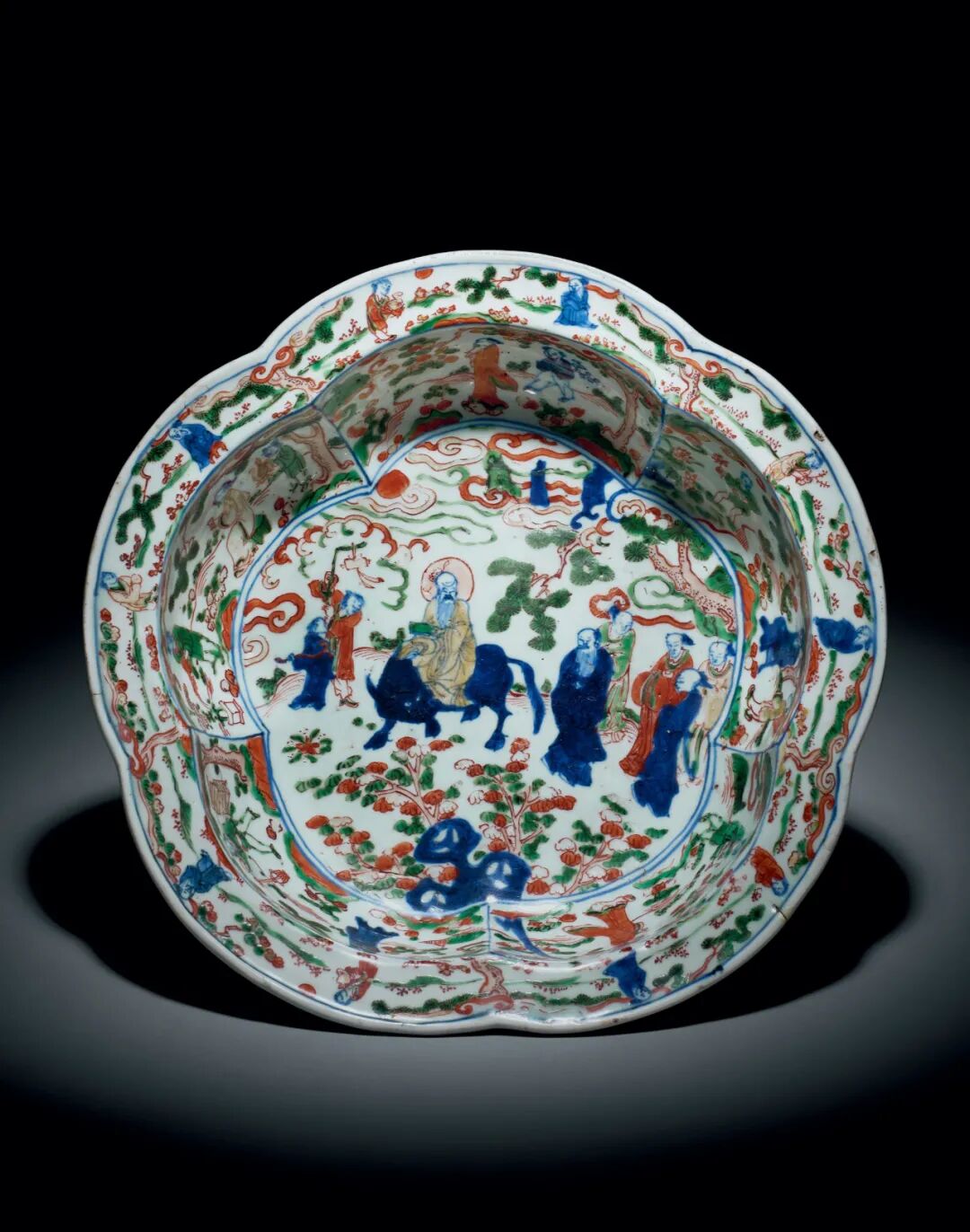 东京中央Liam:本品为明万历官窑,口沿及器身修作花瓣状,六瓣绽开,状若梅花,故在明代宫廷中被称呼为「梅盆」。外壁饰缠枝莲纹,折沿底以缠枝花卉托八宝纹图案,内壁及折沿以五彩满饰姿态颜色各异之山水人物图。盘心绘老子出关图,共绘五彩人物七位。正中老者头罩光环, 神态安详,端坐于青牛之上当为老子。前侧为二书童,后有五人,一长须者为核心。