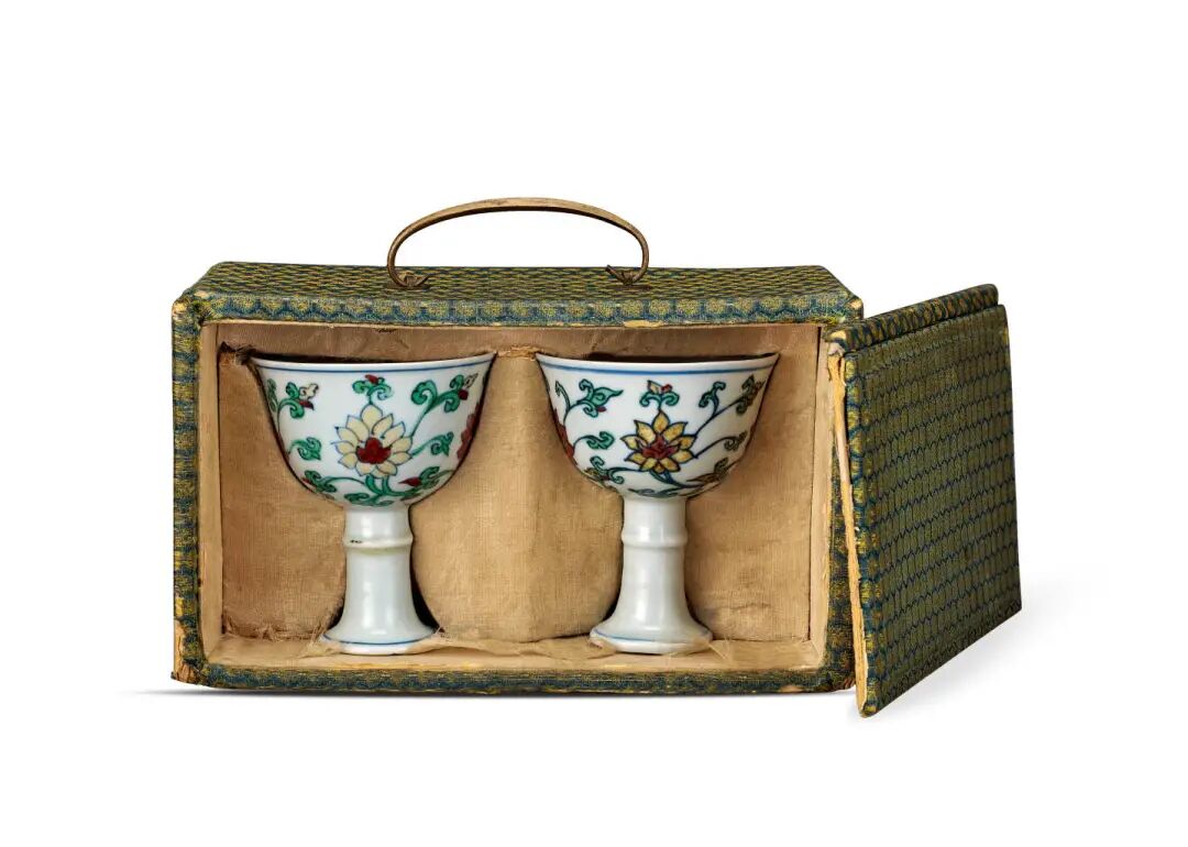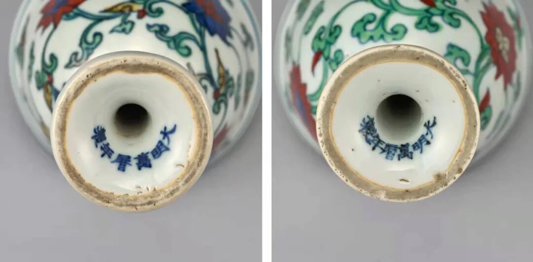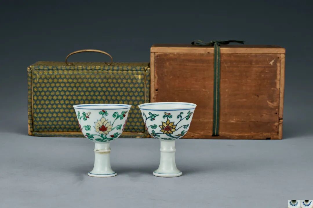 东京中央Liam:此高足杯为一对,均为竹节式的装饰,在古代这样的装饰也寓意为节节高升。器身施白釉,白中微泛青。整体胎质细腻通透,青花呈色淡雅衬托出斗彩之鲜活。杯身绘有宝相花纹四朵,宝相花纹也是中国传统装饰纹样之一,宝相花具有“宝”和“仙”的吉祥含意,是富贵、吉祥、美满的象征。两只杯子都是一样的花型,以五彩填色,层次清晰,展现了万历斗彩之绚丽。斗彩始于宣德时期,成化斗彩最受推崇,此器纹饰、构图有仿成化斗彩之势,但发色为万历斗彩之最佳呈色,底部青花书以“大明万历年制”楷书款。此类器型之万历款的斗彩高足杯目前都少见于其他著录中,台北故宫有一只万历款斗彩高足杯,其余博物馆与私人收藏多见为成化年制。万历成对之佳品可谓极其稀少珍贵。