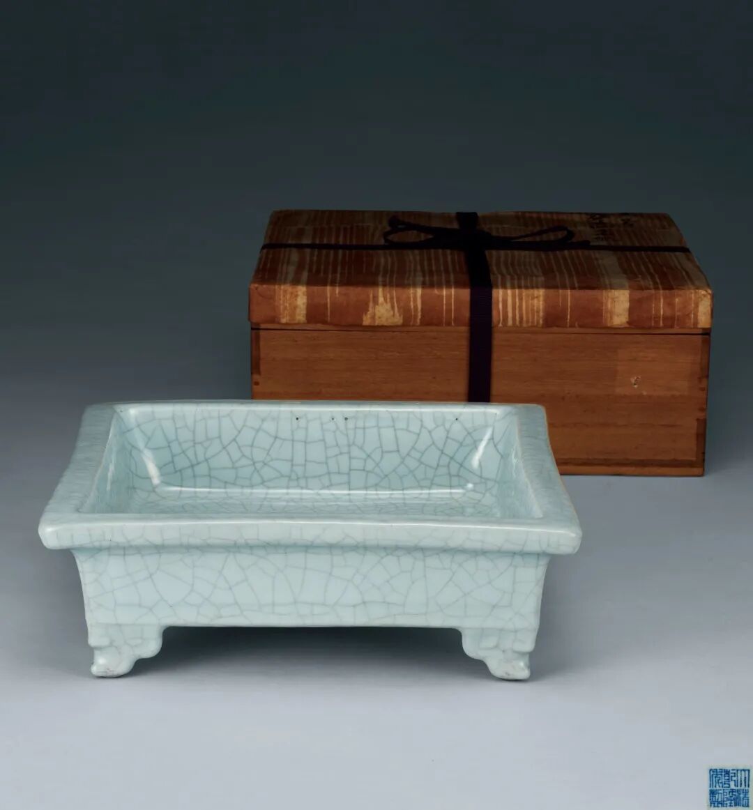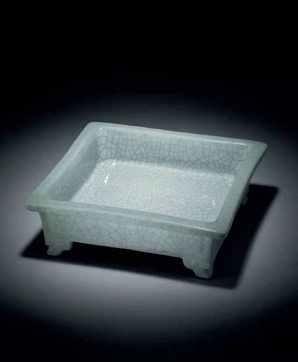 东京中央Liam:此器作四方状,四角规整大气,下承如意云头足四只,足底露深色胎。造型素雅简练。清代雍乾治世,国运昌隆,制瓷技艺达到历史高峰。乾隆帝对宋代哥窑尤其欣赏,故当时崇古摹古之风盛行。此器釉面为「仿哥釉」,釉面之上遍布开片,以仿宋代哥窑器为制作是乾隆仿古之典型。水仙盆是宋人雅致生活之代表器物,整器造型素雅,可為乾隆仿哥水仙盆中之精品。此器底部以青花书以「大清乾隆年制」六字篆书款。为日本私人舊藏。