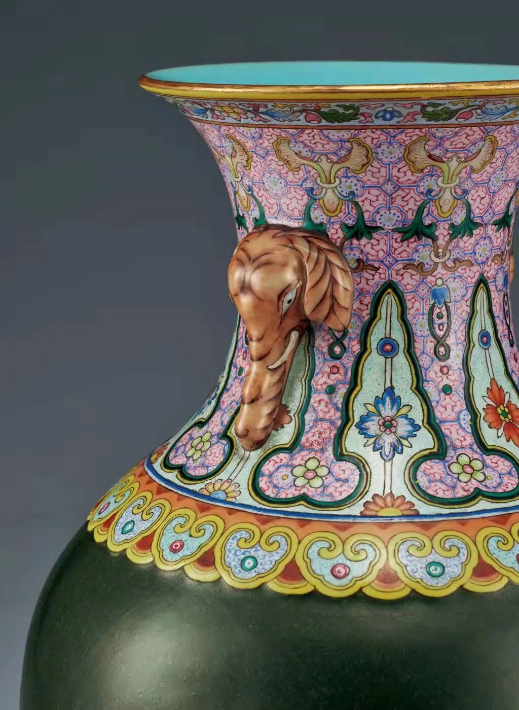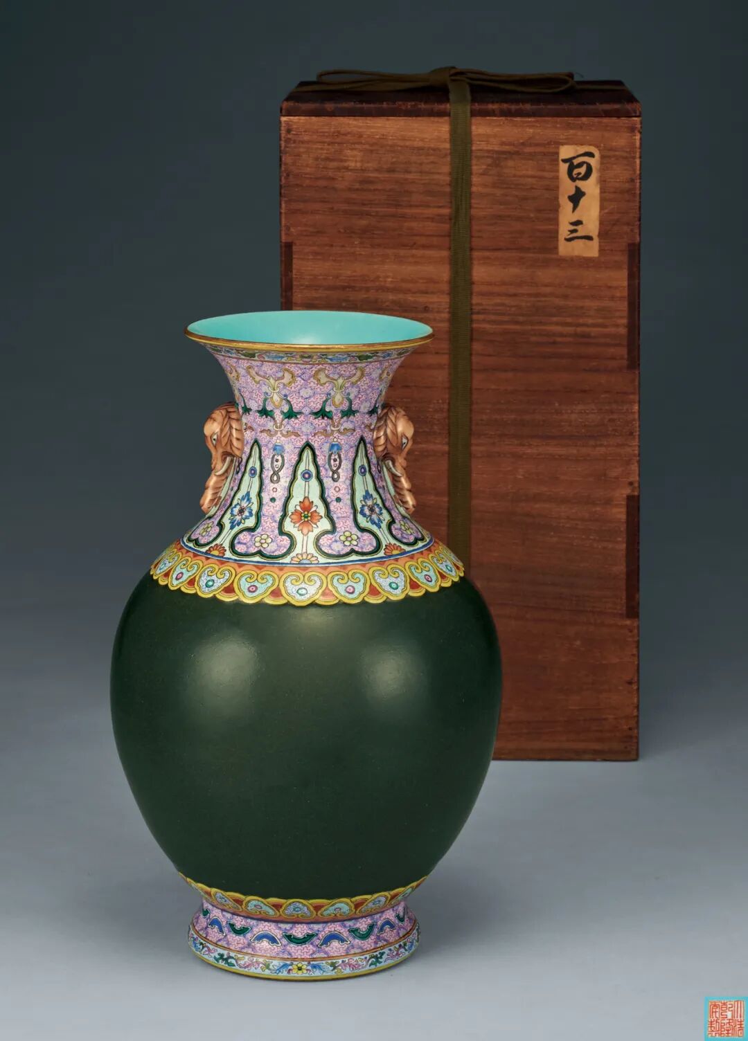 东京中央Liam:本器颈部以胭脂红彩料为地,口足部皆以饰洋彩纹样。瓶口施金釉,颈部双象耳,勾画缠枝花卉并蝶纹,整体用色及纹饰十分精致。主体所施单色釉为厂官釉,俗称茶叶末釉。在《南窑笔记》中记载到 :“(厂官窑)其色有鳝鱼黄、油绿、紫金等”。我们此拍品的颜色接近于鳝鱼黄。瓶内与底足均为松石绿釉,底部以红彩书写“大清乾隆年制”六字篆书款。