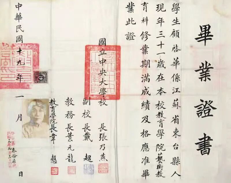 中央大学艺术科首届毕业生为民国十八年(1929年)毕业的徐风等6人,顾启华作为第二届毕业生,毕业时间为民国十九年(1930年),现存的顾启华中央大学毕业证上的颁发时间是在1930年1月。顾启华在进入中央大学艺术科的三年求学生涯经历中,接触认识了一批老师与同窗,许多老师当年已拥有极高的社会知名度,徐悲鸿、吕凤子、张书旂等,一些同窗日后更是成长为知名的艺术家,吕斯百、张安治等。毫无疑问,中央大学的师友对于二十世纪中国传统国画继承开拓及西画探索发展,发挥了无可替代的深远影响。