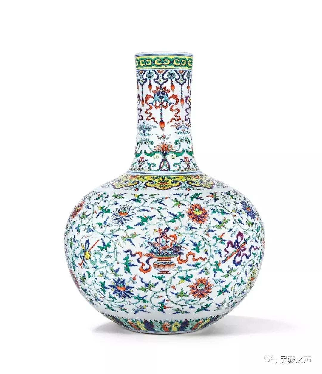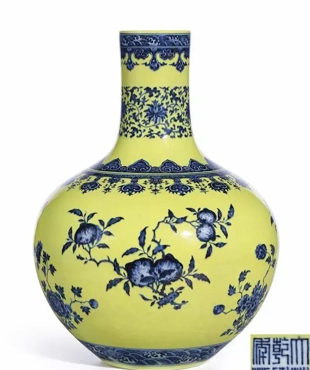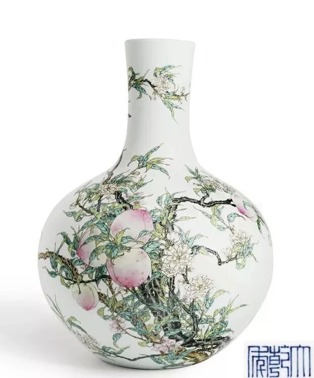 明代天球瓶以青花为主,而雍正、乾隆年间复烧的天球瓶,除了传统的青花外,还创烧了青花釉里红、粉彩、五彩、斗彩等。7058.65万港币(约合人民币5710.48万元)