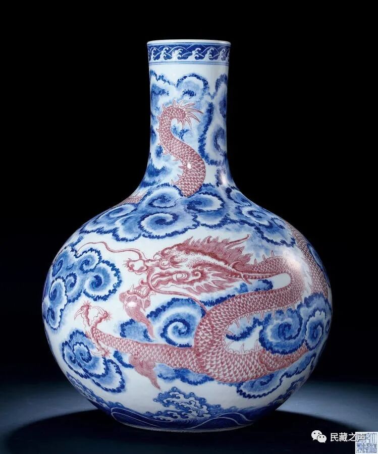 1.472亿的青花釉里红云海腾龙大天球瓶,就是唐英的“唐窑”出品。瓶口绘有一周海水纹,正面龙头上方部分有一段留白,以楷书留有“大清雍正年制”的款识。![]()
