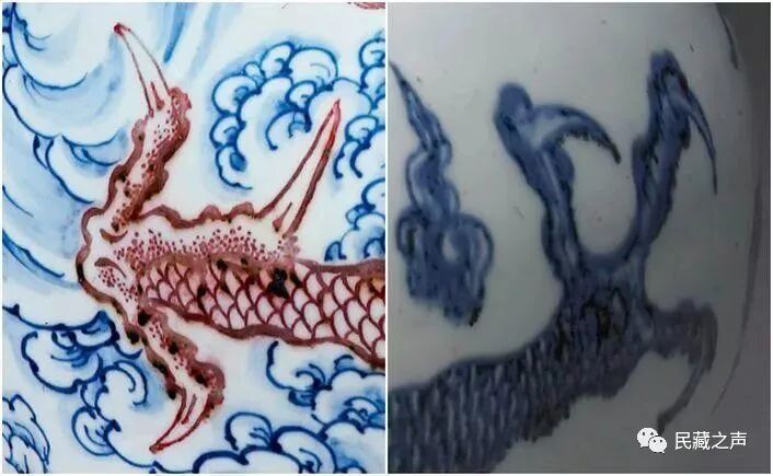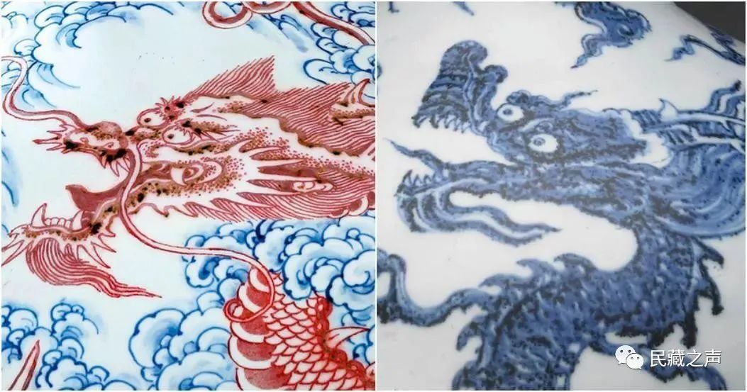 虽然龙爪数量上忠实的向明代学习,但这条红色苍龙身上,同时也保留了雍正年间甚至是整个清朝的时代特征。01 明代龙纹上鄂长,下鄂短,且上鄂向上翻卷;清代龙纹上鄂短,下鄂长。02 明初龙纹舌长且尖,如戟状,清代龙纹舌随下颚伸出,舌尖上卷。![]()