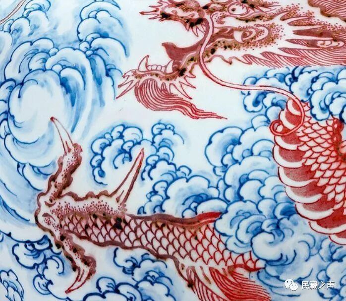 整体以青花作云与海浪,以釉里红绘苍龙。云气翻卷、海浪汹涌间苍龙腾跃,其身形于云气中时隐时现,将飞龙在天的灵动体现得淋漓尽致,极富艺术表现力。![]()