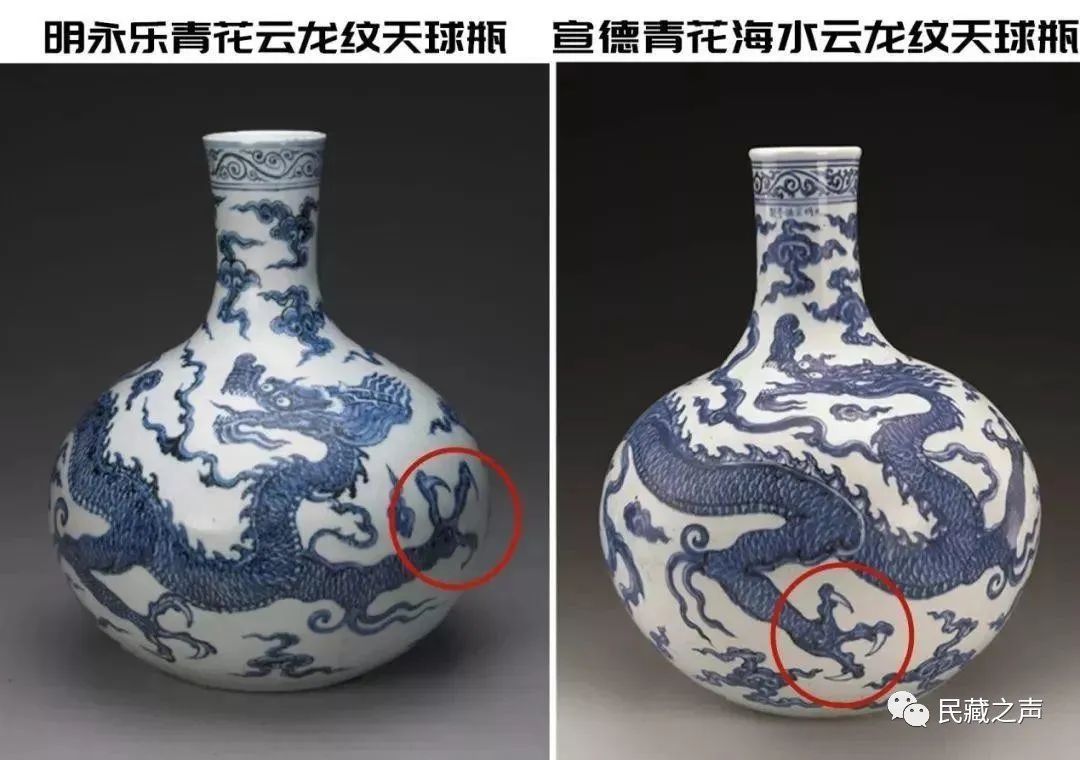 清代复烧天球瓶是为了仿古,这件云海腾龙大天球瓶的造型及纹饰都仿照永、宣年间的天球瓶而来。而我们如今能见到的永宣年间的龙纹天球瓶,比如故宫博物院的明永乐青花云龙纹天球瓶,以及天津博物馆的明宣德青花海水云龙纹天球瓶,龙纹都是三爪。![]()