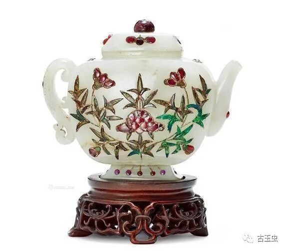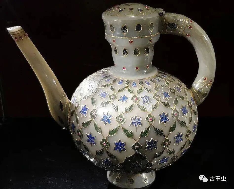 清 白玉雕痕都斯坦嵌宝石花纹壶