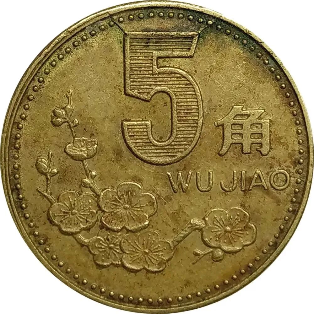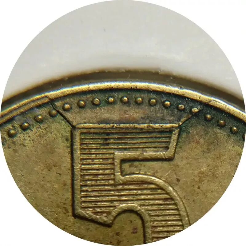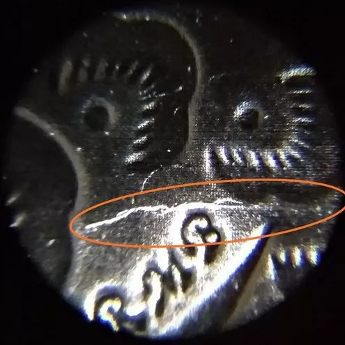 这枚梅花5角,裂的位置非常巧妙,正好从数字5的上横两端向边廓蔓延。随着使用,由裂缝包围的部分已经出现了一定程度的塌陷。