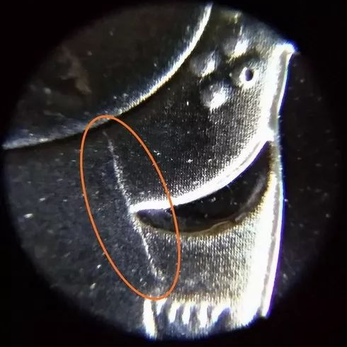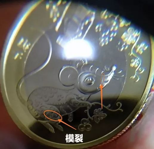 其实,在鼠年纪念币发行的时候,也出现过一枚“模裂币”,在老鼠的嘴边、大腿RMB暗记处,都有“模裂”。当时还以30元/枚的价格成交了。