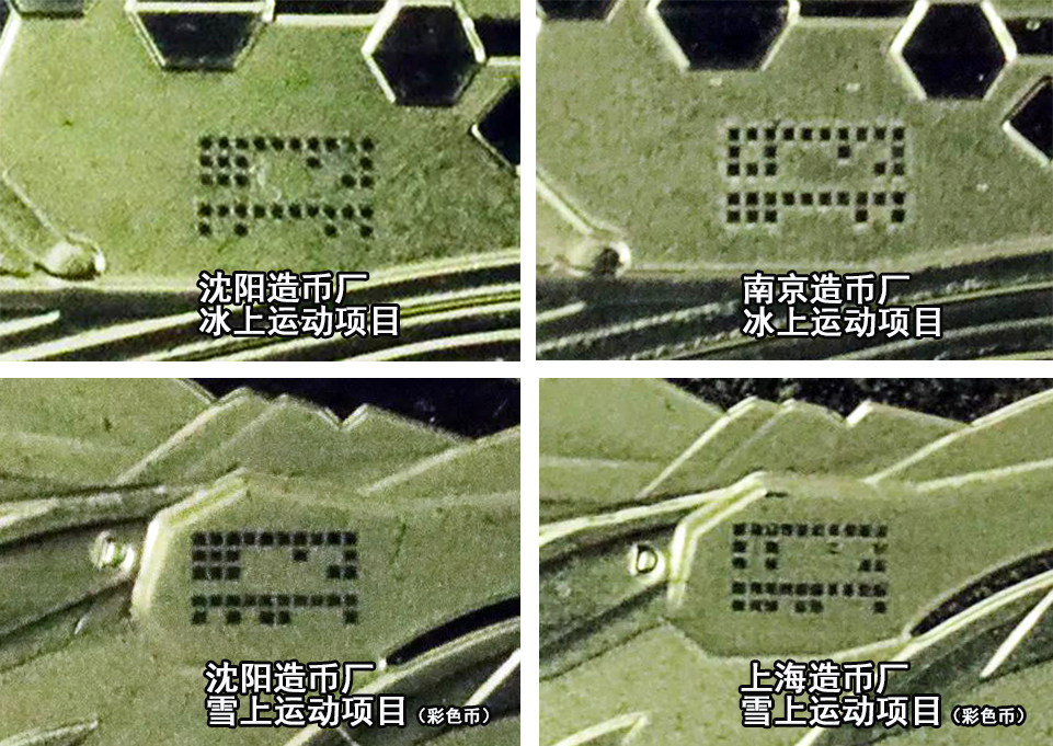 冰上运动项目:沈阳厂生产的币共34个点(20+14),南京厂生产的币也是34个点(19+15),但点阵的排列不同。