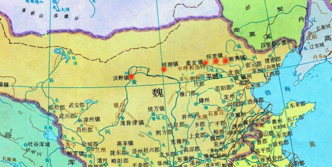 北魏时期的军镇,图源谭其骧《中国历史地图集·南北朝》镇的起源则同军事相关。镇的名称最早正式出现于公元四世纪末至六世纪初中国历史上的北魏时期(北魏拓跋珪称帝后,为保卫都城、防卫北方柔然二设置六镇)。
