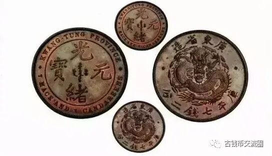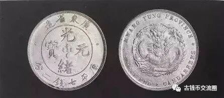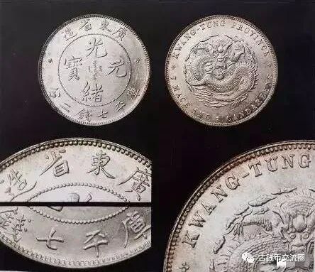“广东省造”的“广”字与“造”字笔画与英国所雕刻者接近;?“库平七钱二分”的“库”字中的车字不出头,且“钱”字中的部首“金”的笔画也不出头;两侧花星为中央有凹点的十字花星。背面:英文KWANG-TNUG中间的连接号“-”短,两侧花星亦为中央有凹点的十字花星。