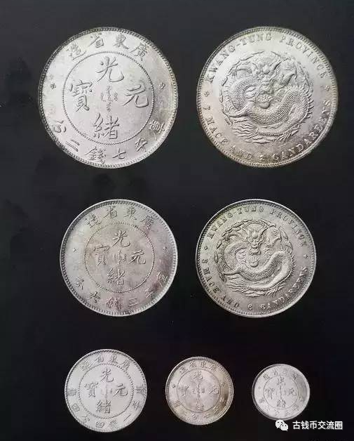广东钱局在七钱三分系列银圆发行不畅后,将“一圆”主币的重量由七钱三分减为七钱二分,其余面额依序递减。币模是在英国伯明翰造币厂原来所提供的模具基础上略加修改而成,其中部分面额的模具在蟠龙两侧各添加一花星。 然而,从七钱_二分版背面的阿拉伯数字“2”观察,其笔法相当拙劣,雕刻水平与原本的“3”字相去甚远,加上龙鳞较浅,显然不是由原雕刻师所为,而是广东钱局自行刻制字模,再利用喜敦厂提供的模具辗转进行复制的。 由于这曲套最早生产及自行刻模的银圆因英文出现于正面而与后续的不同,被泉界称为“反版”,其中“七二反版”系列是真正在中国制作原模的第一套银圆,仅试制若干而未正式发行,故极为罕见。![]()